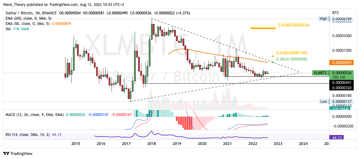 Der Stellar Lumens Kurs befindet sich in einem symmetrischen Dreieck, bei dem der 50-Monate-EMA und das 0,382 Fib Niveau den oberen Widerstand markieren, dessen Bruch ein bullischer Ausbruch zur Folge hätte. Bricht der XLM Kurs den Widerstand bei rund 0,0000086 BTC also bullisch, könnte Stellar bis rund 0,000012 BTC steigen.
