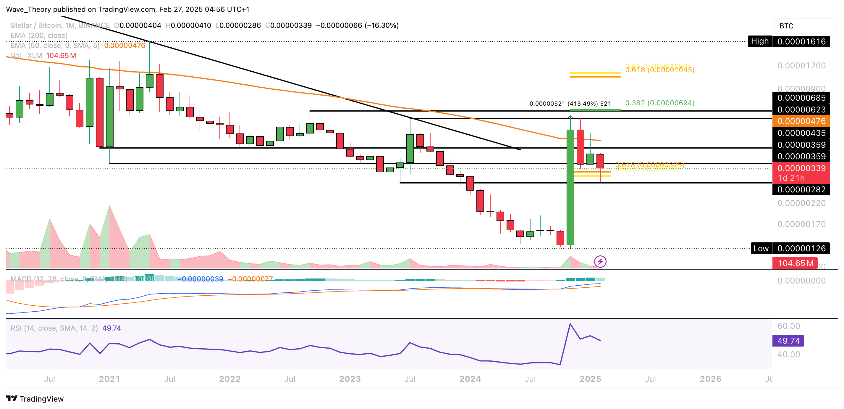 Gegen Bitcoin stößt der Stellar Lumens Kurs ebenfalls auf Golden Ratio Unterstützung, welche hier bei rund 0,0000032 BTC liegt. Dort könnte der Kurs bullisch abprallen, um den 50-Monate-EMA bei rund 0,00000476 BTC anzuvisieren.
