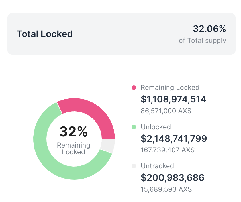 Nach Angaben von TokenUnlocks werden heute über 4,8 Millionen AXS-Token ausgegeben, was 1,8 % des Gesamtangebots von 270 Millionen entspricht. Davon sind aktuell 32 % gesperrt.