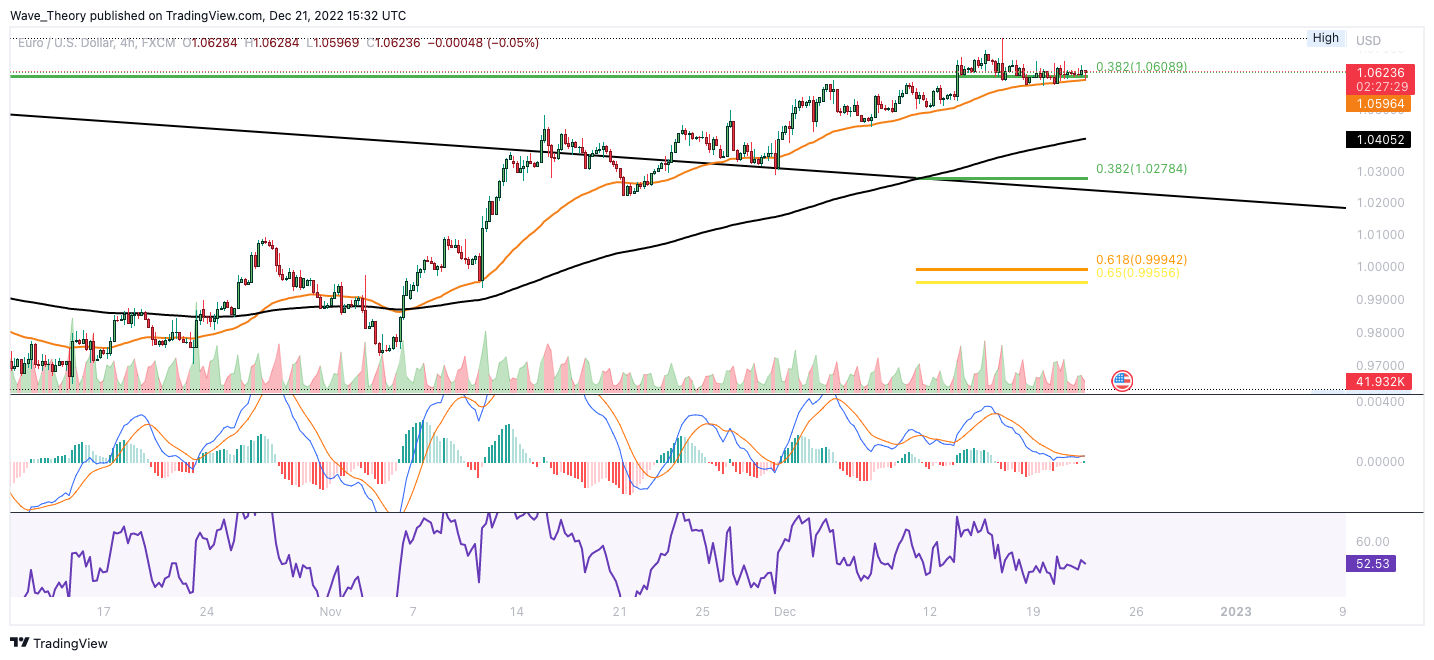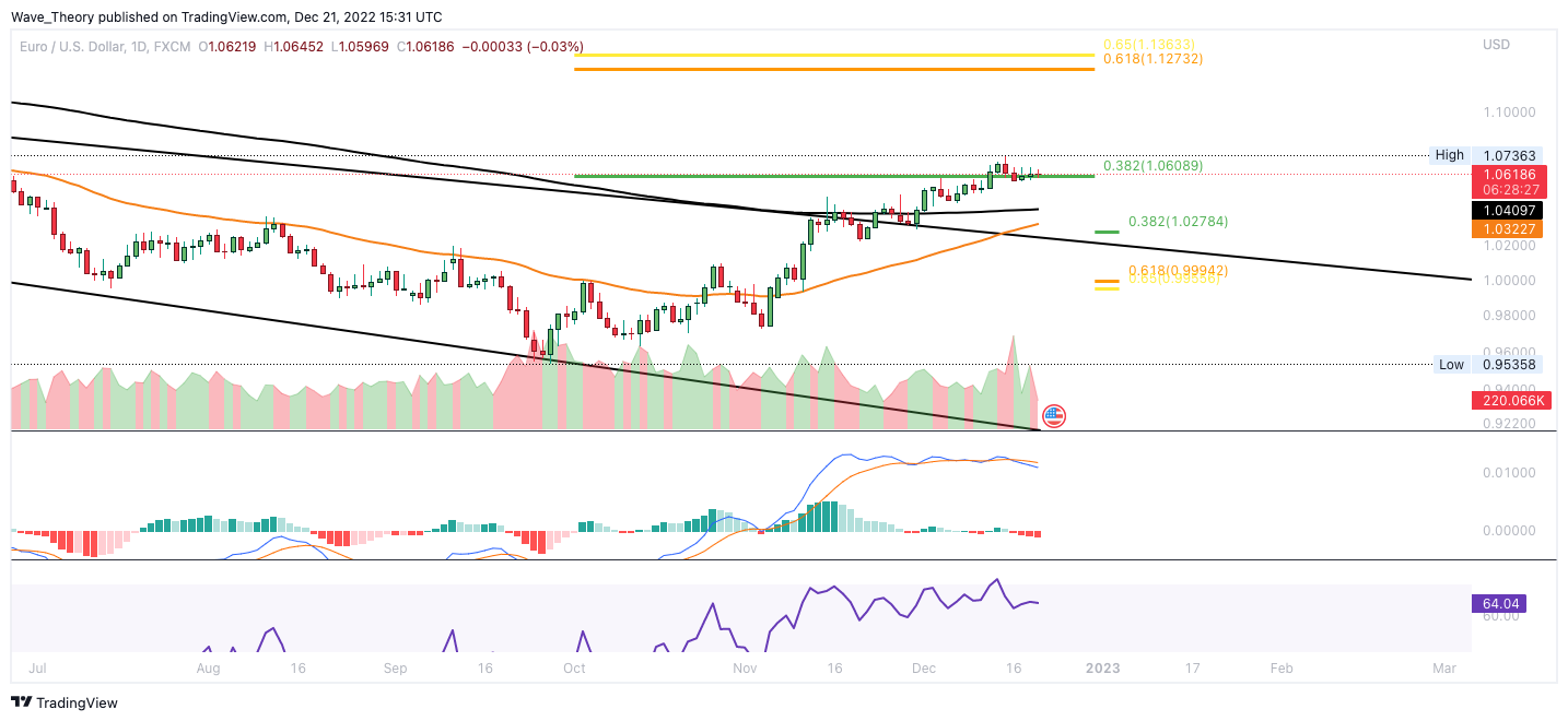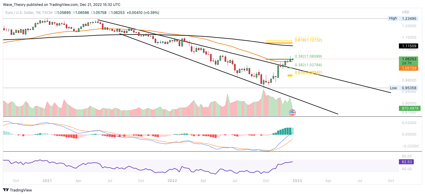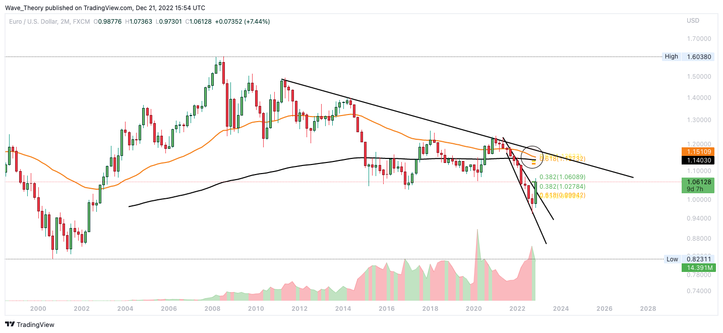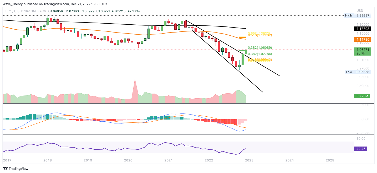 Seit Oktober tickt das Histogramm des MACDs im Monatschart bullisch höher. Zudem konnte der Euro-Kurs den Trendlinienwiderstand bei rund 1,04 USD bullisch brechen. Aktuell befindet sich der EUR-Kurs an signifikantem Fib Widerstand bei rund 1,06 USD. Bricht der Euro-Kurs bullisch aus, könnte er den 50-Monate-EMA an der Golden Ratio zwischen rund 1,117 USD und 1,13 USD anvisieren.