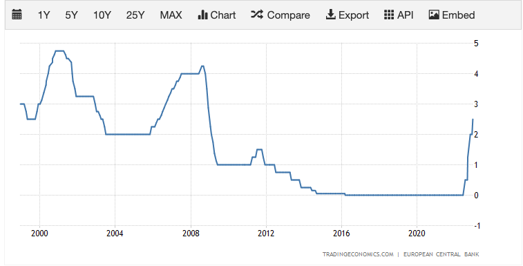 Die EZB senkte ihren Zinssatz nach 2008 stark. Statt den Zinssatz sofort auf 0 % zu senken, senkte die Europäische Notenbank diesen sukzessive.