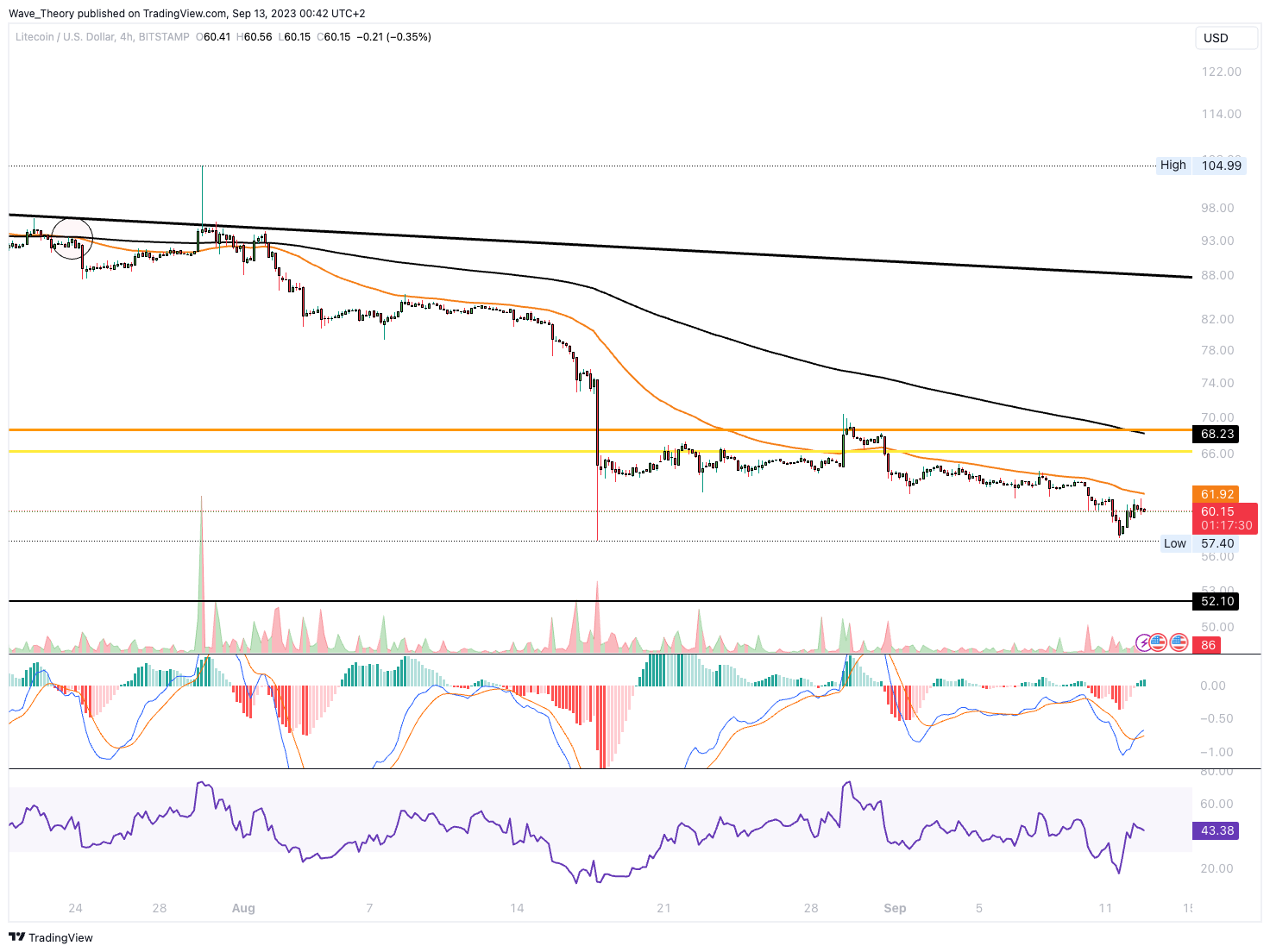 Im 4H-Chart zeigt sich der MACD derzeit bullisch, denn die MACD Linien sind bullisch überkreuzt und das Histogramm des MACDs weist einen bullischen Trend auf. Nichtsdestoweniger könnte LTC jetzt bereits am 50-4H-EMA Widerstand bei rund 62 USD scheitern. Zudem liegt im 4H-Chart ebenfalls ein Death Cross vor, womit der Trend auch kurzfristig bärisch bestätigt ist.