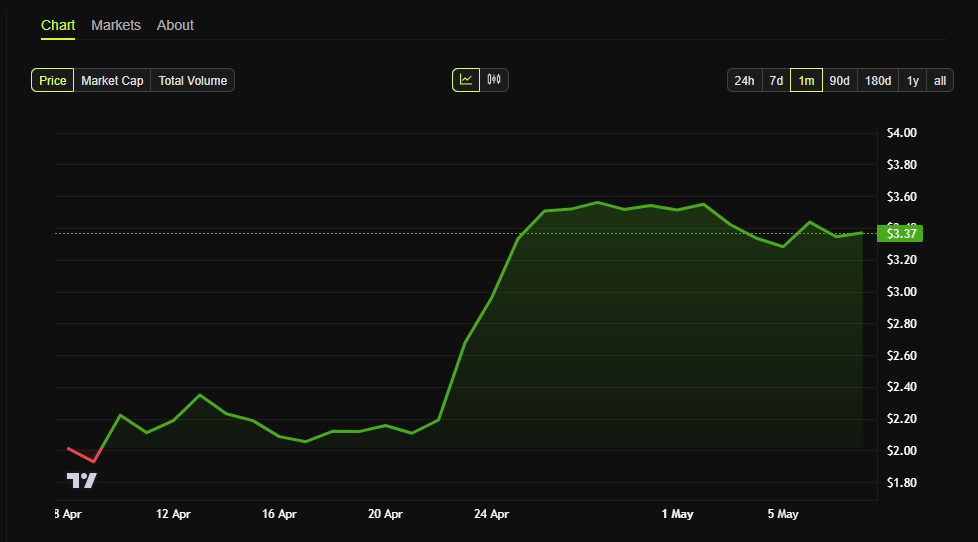 Aktuell wird SUI bei etwa 3,25 USD gehandelt und hat sich fast 90 Prozent vom April-Tief von 1,73 USD erholt.