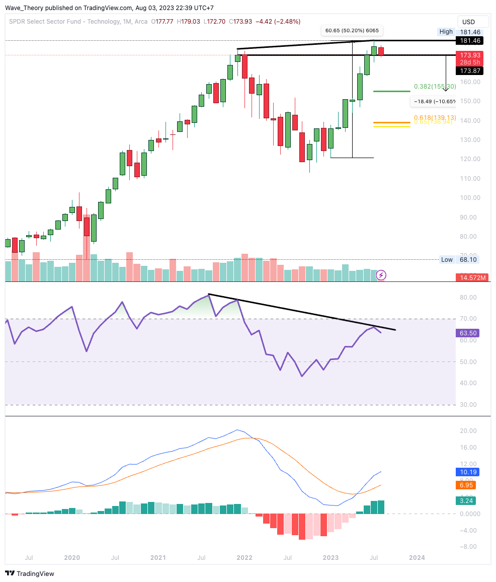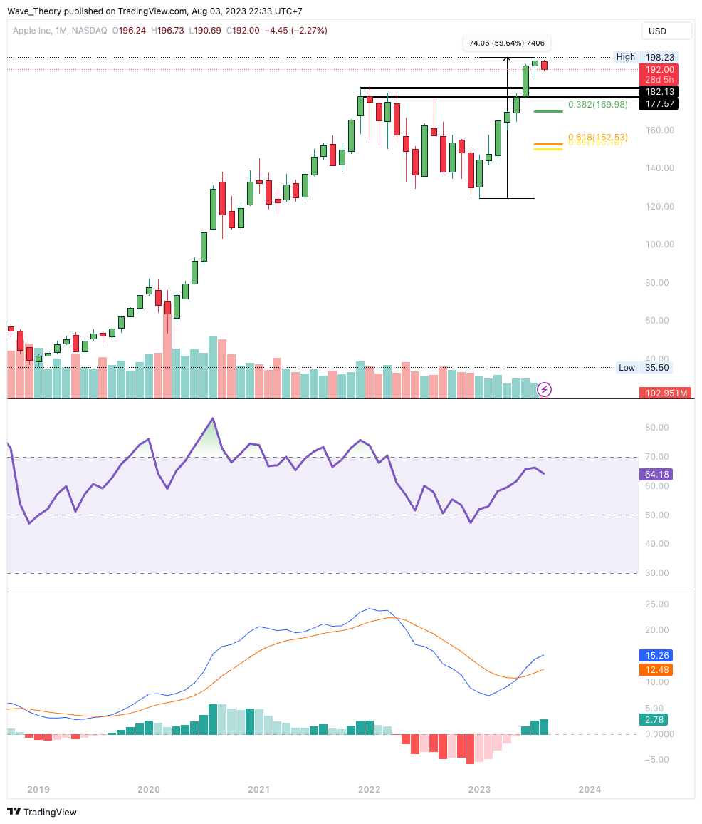 Nichtsdestoweniger scheint der Apple Kurs in diesem Monat eine Korrektur zu initiieren. Schließlich weist der RSI auch eine massive bärische Divergenz im RSI im Monatschart auf. Damit könnte es mit dem Aufwärtstrend vorerst vorbei sein. Sollte Apple die nächste horizontale Unterstützung zwischen rund 177,6 USD und 182 USD bärisch brechen, warten bei rund 170 USD und bei rund 150 USD die nächsten signifikanten Fib Unterstützungen.