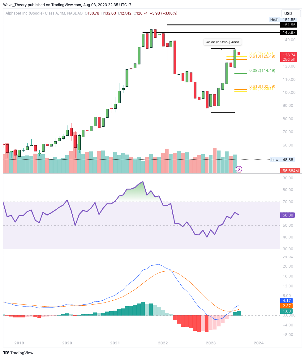 Die Big Tech Google Aktie konnte zwar kein neues ATH erreichen, jedoch immerhin den Golden Ratio Widerstand bei rund 128 USD brechen. Damit befindet sich Apple auch wieder im Bullentrend. In Zuge dessen konnte die Apple Aktie Kursgewinne von rund 57,6 % in diesem Jahr verzeichnen. Jedoch beginnt der August ebenfalls bärisch für den Apple Kurs.