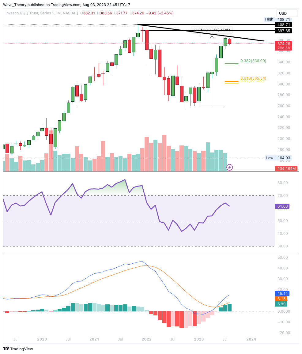 Nichtsdestoweniger beginnt auch das InvescO QQQ Trust ETF eine Korrekturbewegung in diesem Monat. Die nächsten signifikanten Fibonacci Unterstützungen warten bei rund 337 und 300. Nach oben hin wartet der nächste signifikante Widerstand zwischen rund 398 und 409.