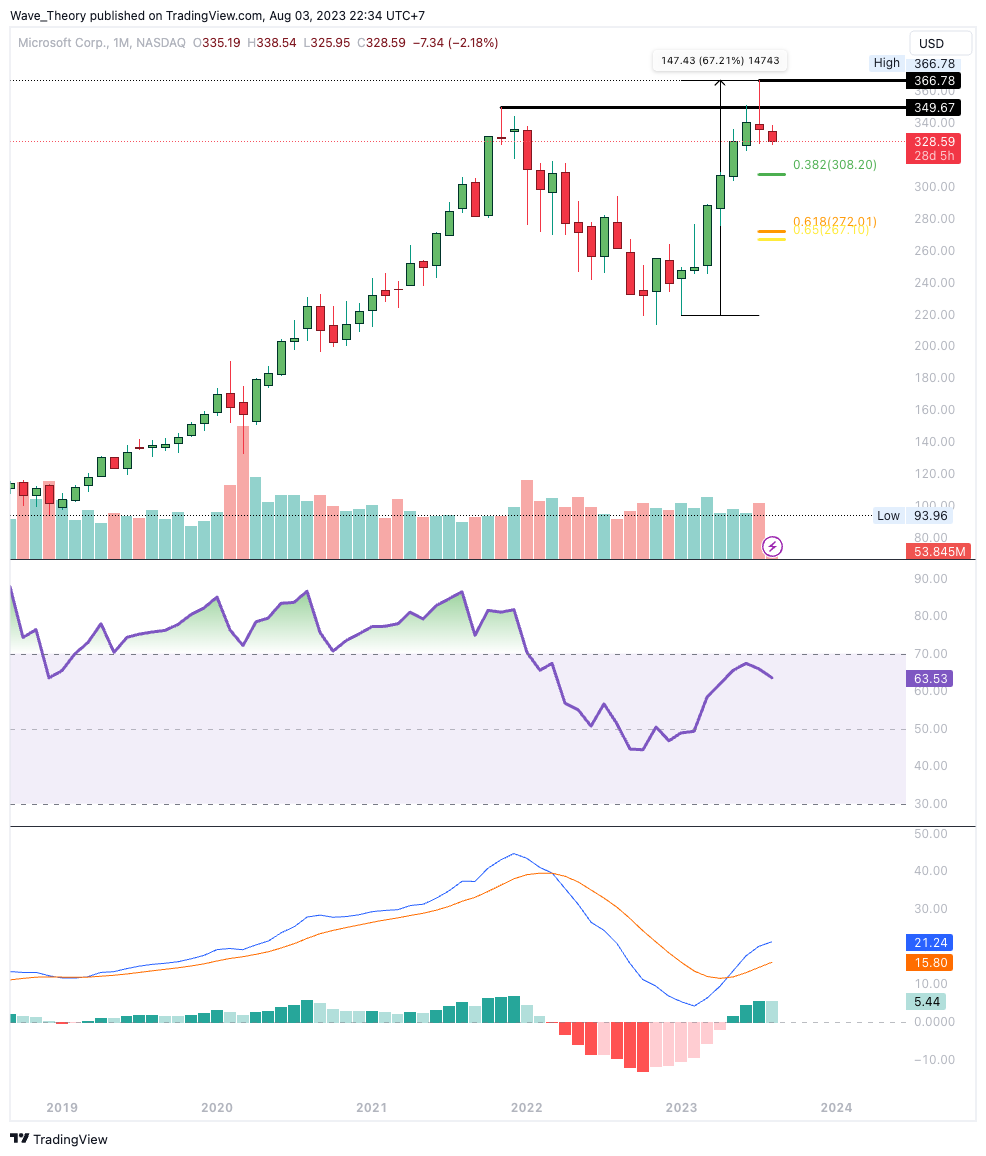 Auch der Microsoft Kurs konnte in diesem Jahr auf ein neues ATH klettern. Doch daraufhin initiierte Microsoft eine sehr heftige Korrektur, die bei rund 308 USD respektive 270 USD ihr Ende finden könnte. Denn dort stößt Microsoft auf die nächsten signifikanten Fib Unterstützungen.