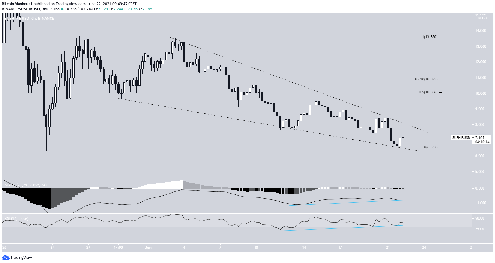 Am 23. Mai 2021 gab es eine Aufwärtsbewegung, die bis zum 3. Juni 2021 andauerte. Seitdem wird der SUSHI Preis wie auch der CRV und der ZEC Preis innerhalb eines absteigenden Keilmusters gehandelt. Allerdings gibt es sowohl auf dem RSI als auch auf dem MACD eine bullische Divergenz zu sehen. Das ist ein mögliches Anzeichen dafür, dass sich der Trend umkehren wird. Darum wird der SUSHI Kurs wohl bald aus dem Keilmuster ausbrechen. Der nächste Widerstandsbereich liegt zwischen 10.06 USD und 10.90 USD.