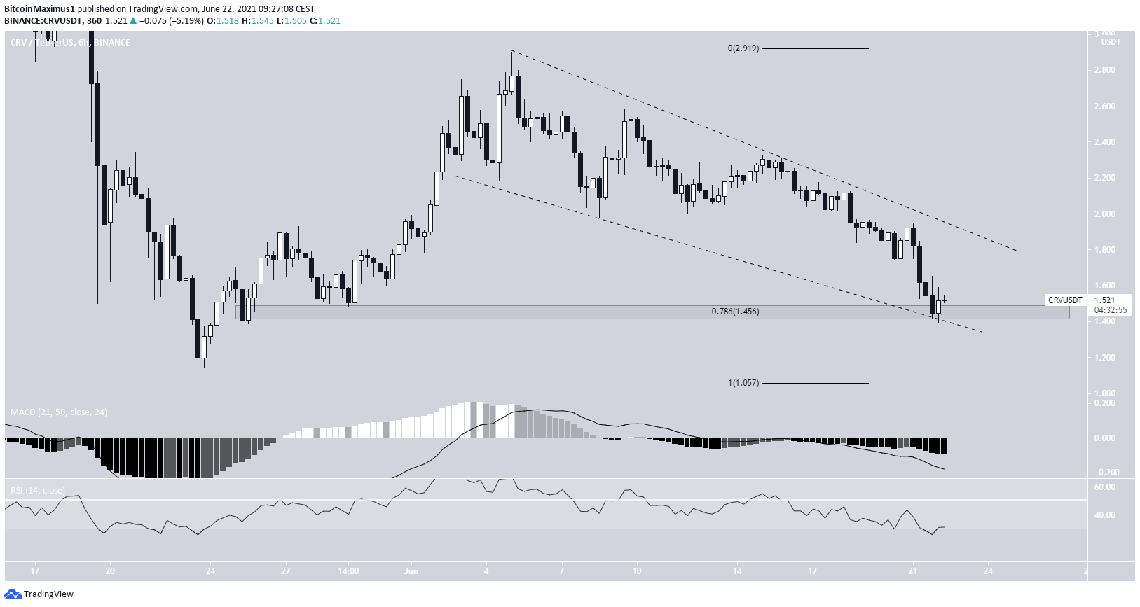 Der CRV Preis begann am 23. Mai 2021 wieder zu steigen und erreichte am 5. Juni 2021 den letzten Hochpunkt bei 2.90 USD. Der CRV Kurs ist seitdem wieder gefallen und wird möglicherweise innerhalb eines absteigenden Keilmusters gehandelt. Heute ist der CRV Preis auf die Support-Linie des Keils gefallen und erholte sich schließlich wieder. Die Linie ist zudem bei dem 0.786-Fib-Retracement-Support-Level. Allerdings gibt es bis jetzt noch keine Anzeichen dafür, dass sich der Trend umkehren wird bzw. dieser bullisch ist. Sollte der CRV Kurs unter die Linie fallen, dann wird er sich wahrscheinlich in Richtung der Tiefpunkte bei 1.05 USD bewegen.