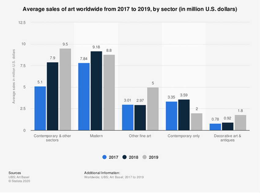 Es gibt ein vielfältiges Spektrum an angewandter Kunst und bildender Kunst, das von traditionellen Skulpturen und Gemälden über Film, Fotografie, Grafikdesign, Performance (schwer einzuschätzen), Animation und sogar Videospiele reicht. Die durchschnittlichen Verkäufe von Kunst nach Sektoren weltweit von 2017 bis 2019 sind in Abbildung 1 dargestellt. Die Geschichte der Menschheit wird durch Meisterwerke als Chronologie dargestellt. Jede Periode der Zivilisation hatte ihre eigenen spezifischen Trends. Während es früher eine Geschichte der „Hochkultur“ war, ändern neuere Entwicklungen dieses Paradigma in Richtung einer weitaus stärkeren Exposition gegenüber den Massen.