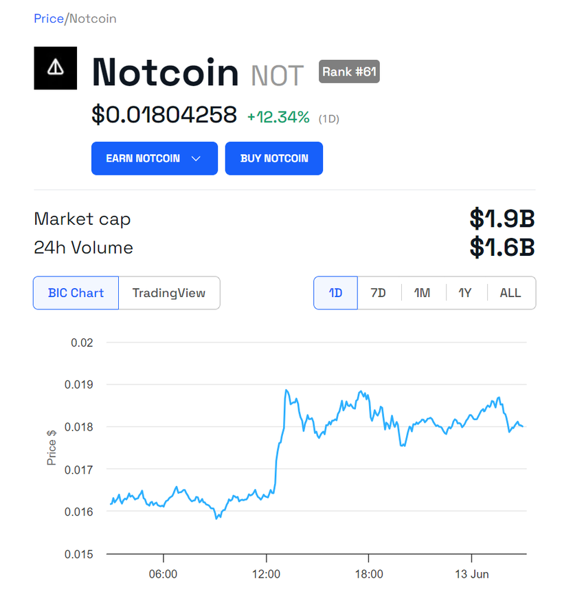 SponsoredNach der Listung positionierte sich Notcoin schnell unter den Top 100 Kryptowährungen nach Marktkapitalisierung. Zum Zeitpunkt des Schreibens beträgt seine Marktkapitalisierung 1,86 Milliarden USD und es wird bei 0,01804 USD gehandelt.