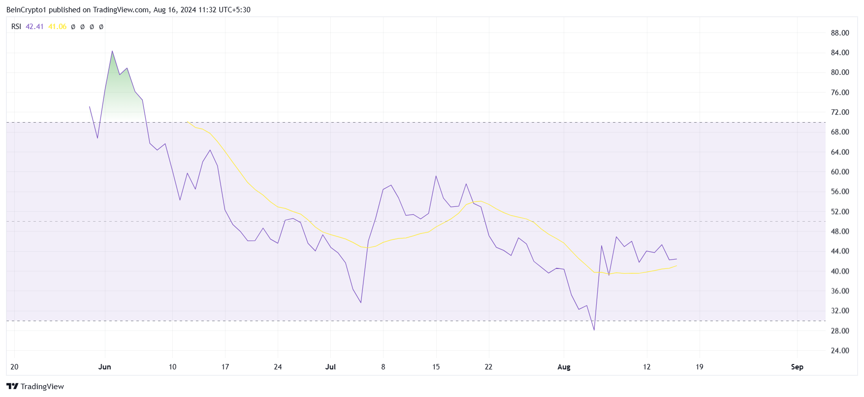 Der Notcoin Kurs zeigt einen Rückgang, hauptsächlich, weil das Interesse an Telegram Coins nachlässt. Zudem sind die allgemeinen Marktsignale nicht besonders bullisch. Der Relative Strength Index (RSI) von Notcoin zeigt, dass es der Altcoin schwer hat, eine starke bullische Dynamik aufzubauen.