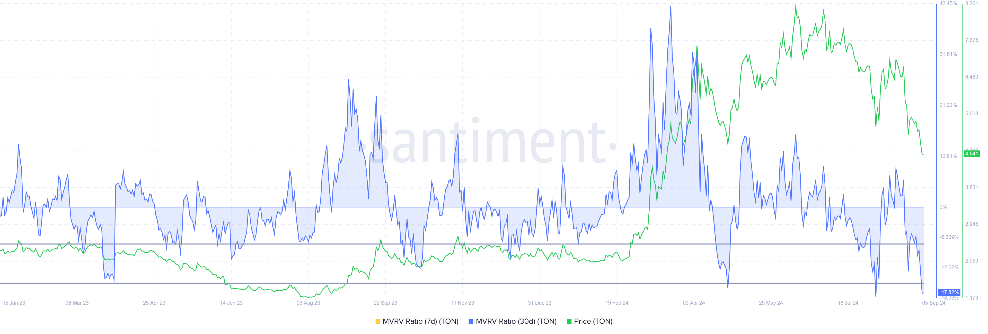 Das Potenzial der Akkumulation wird durch das Verhältnis von Marktwert zu realisiertem Wert (MVRV) unterstützt, das die Gewinne und Verluste der Investoren misst. Derzeit liegt das MVRV-Verhältnis von TON bei -17 Prozent, was darauf hindeutet, dass viele Halter Verluste erleiden. Dies könnte jedoch auch das Ende des Verkaufsdrucks bedeuten, da Investoren weniger geneigt sind, mit Verlust zu verkaufen.