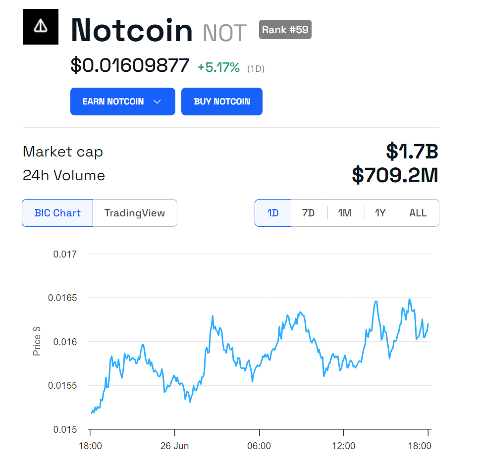 Aktuell hat Notcoin eine Marktkapitalisierung von 1,65 Milliarden USD. Trotz dieses bedeutenden Betrags ist dieser Wert im Vergleich zum 3. Juni um etwa 40,6 Prozent gesunken. Auch der Kursverlauf teilt ein ähnliches Schicksal und liegt 43,4 Prozent unter seinem Allzeithoch von 0,02836 USD. NOT wird derzeit bei 0,01609 USD gehandelt.