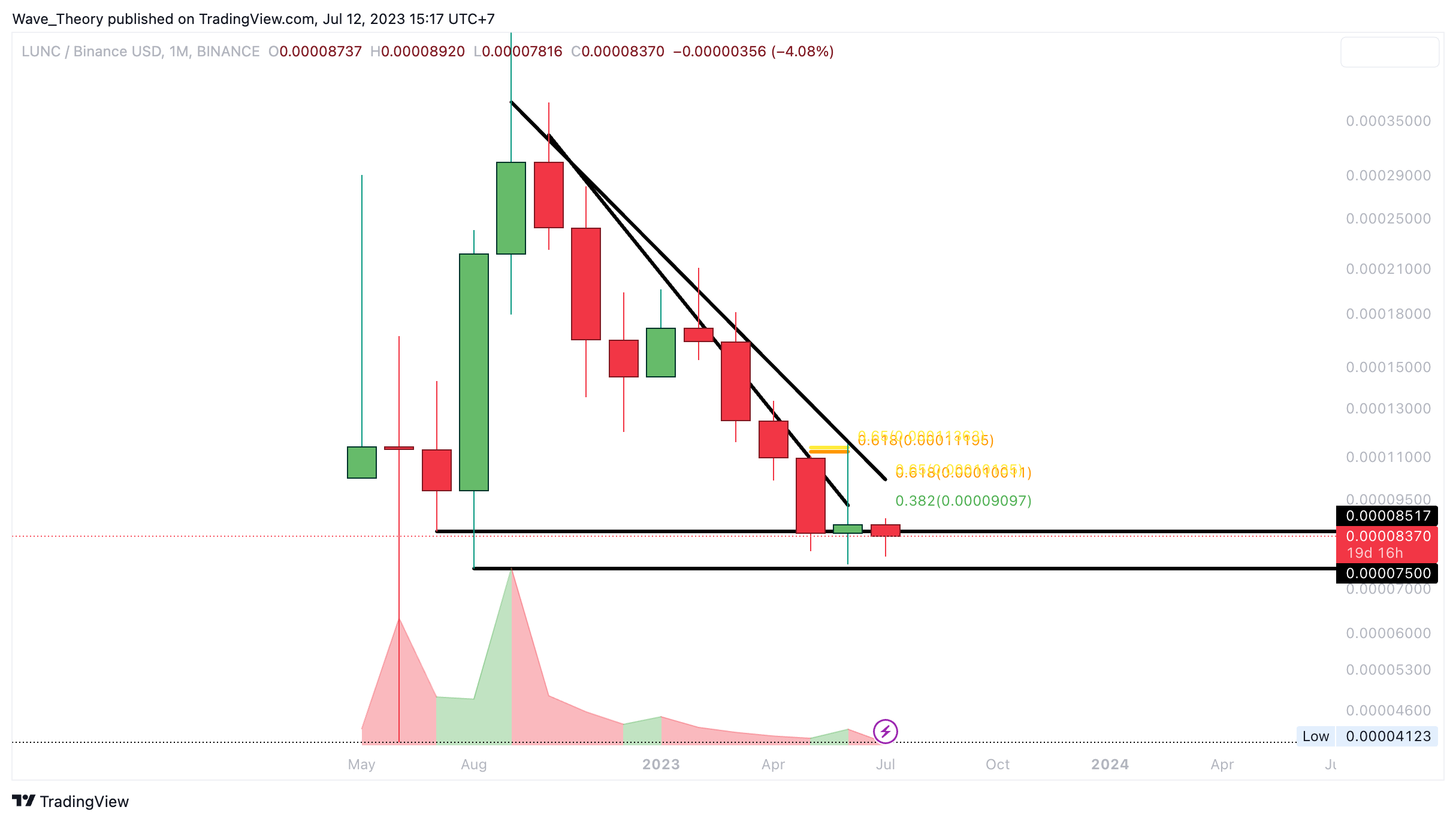 Im Monatschart wird deutlich, dass sich Terra Classic an der letzten Unterstützung befindet, bevor ein Absturz erfolgen könnte. Denn wenn diese Unterstützung bricht, könnte der Kurs eine Etage tiefer fallen, um den absoluten Tiefpunkt bei rund 0,000041 USD zu erreichen.