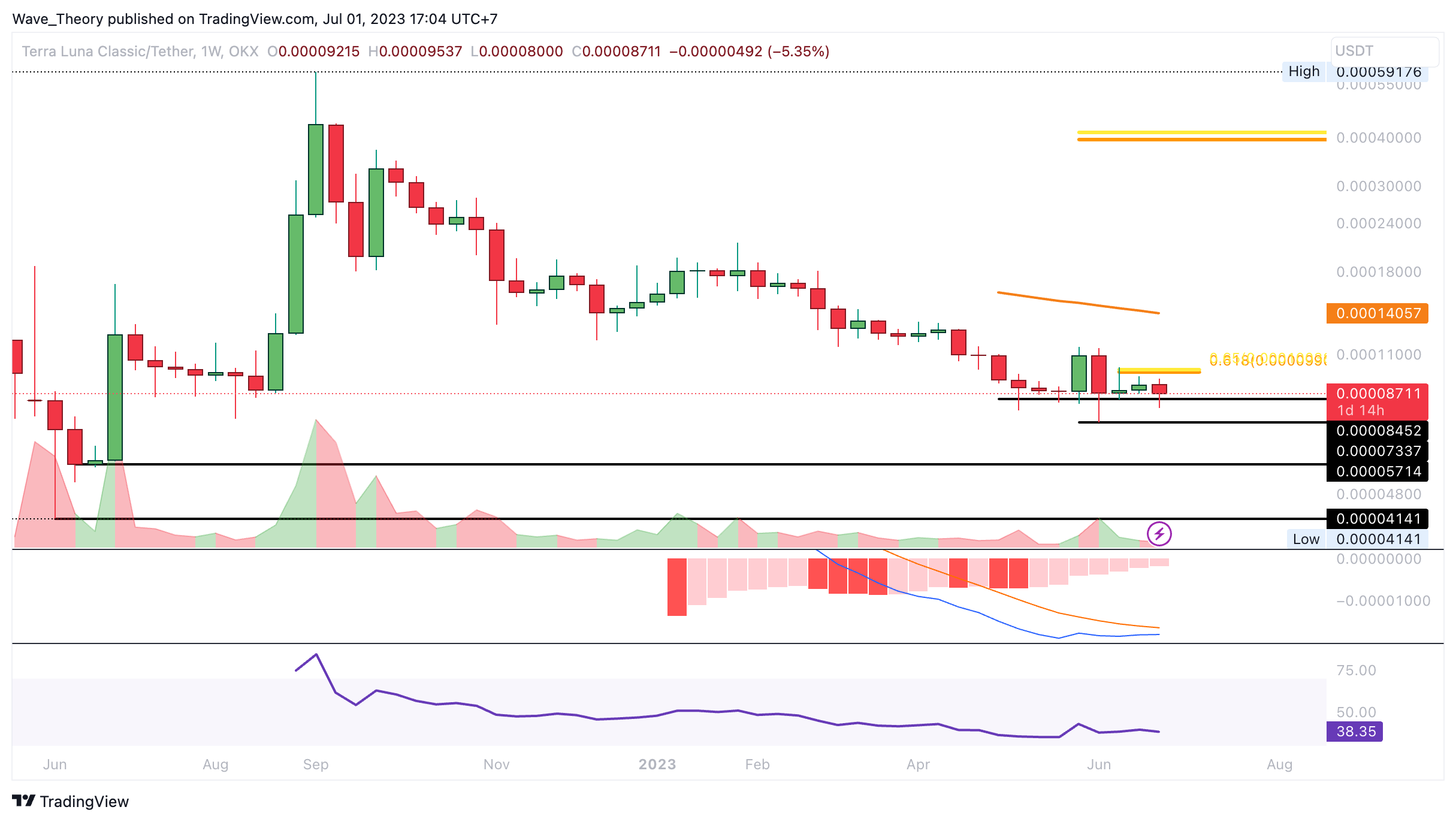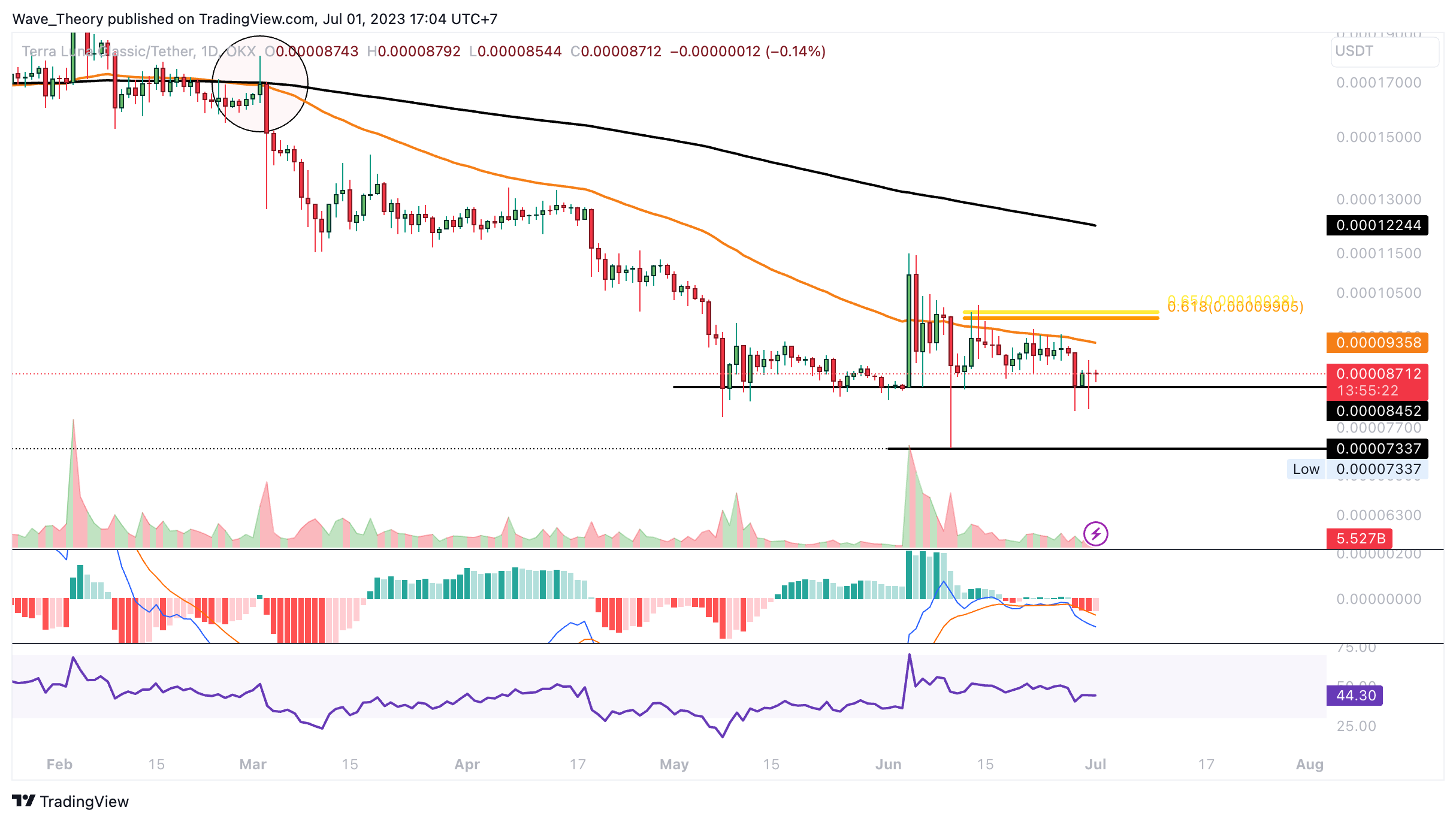 Der LUNC Kurs konnte letzten Monat nicht über 0,00010971 USD schließen, womit es für “Bullish-Engulfing-Candle” im Monatschart nicht gereicht hat. Damit gibt es auch keine Anzeichen auf eine bullische Trendumkehr.