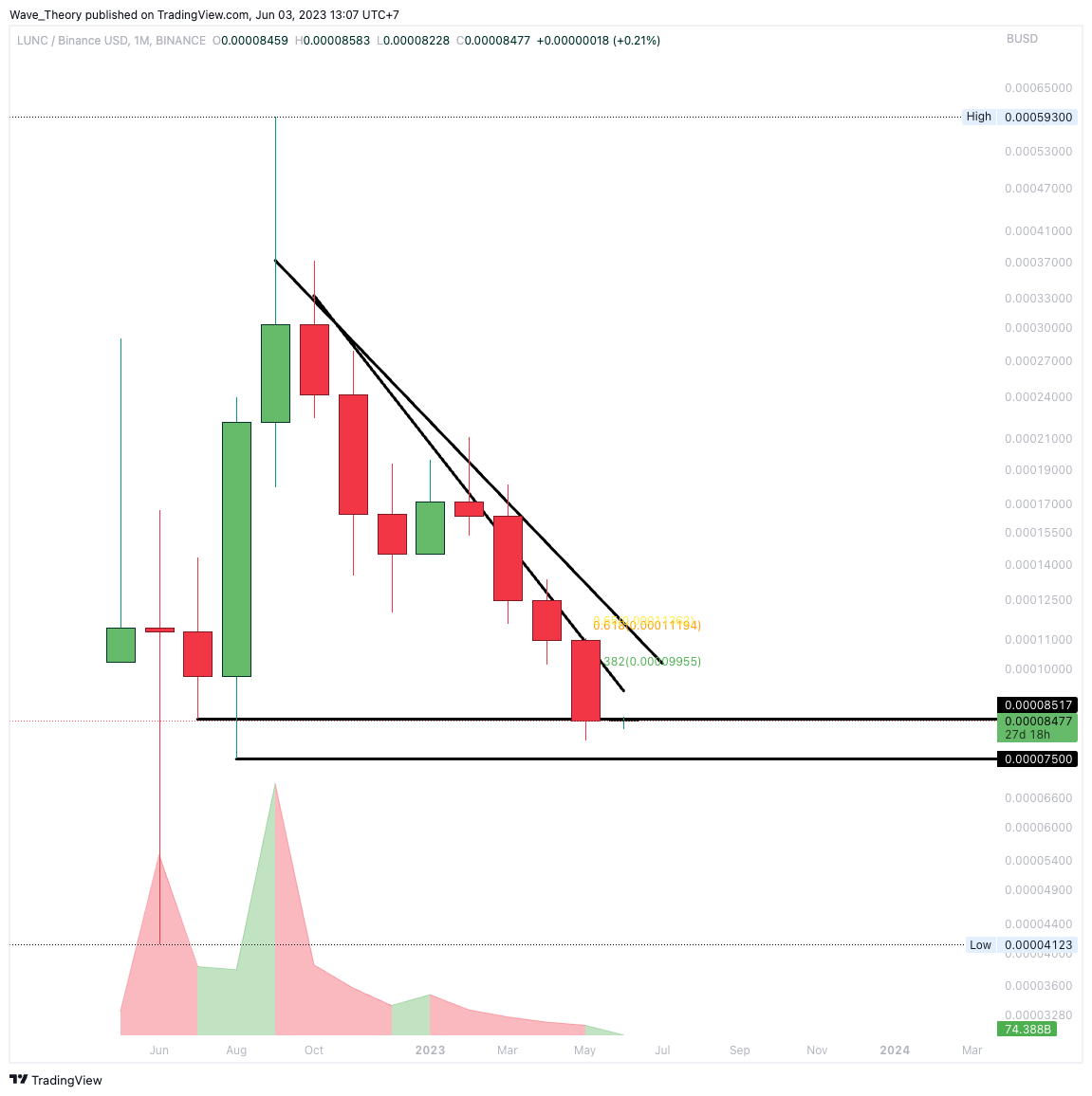 Der Kurs von LUNC hat nun die letzte Unterstützungszone erreicht, was auf einen möglichen starken Rückgang hindeutet. Die gegenwärtige Unterstützung, die sich zwischen etwa 0,000075 USD und 0,0000852 USD befindet, stellt die letzte Verteidigungslinie dar, bevor der Kurs möglicherweise auf etwa 0,00004123 USD sinken könnte. Dies wäre der tiefste Stand, den LUNC seit dem Handel von Terra Classic auf Binance erreicht hat.