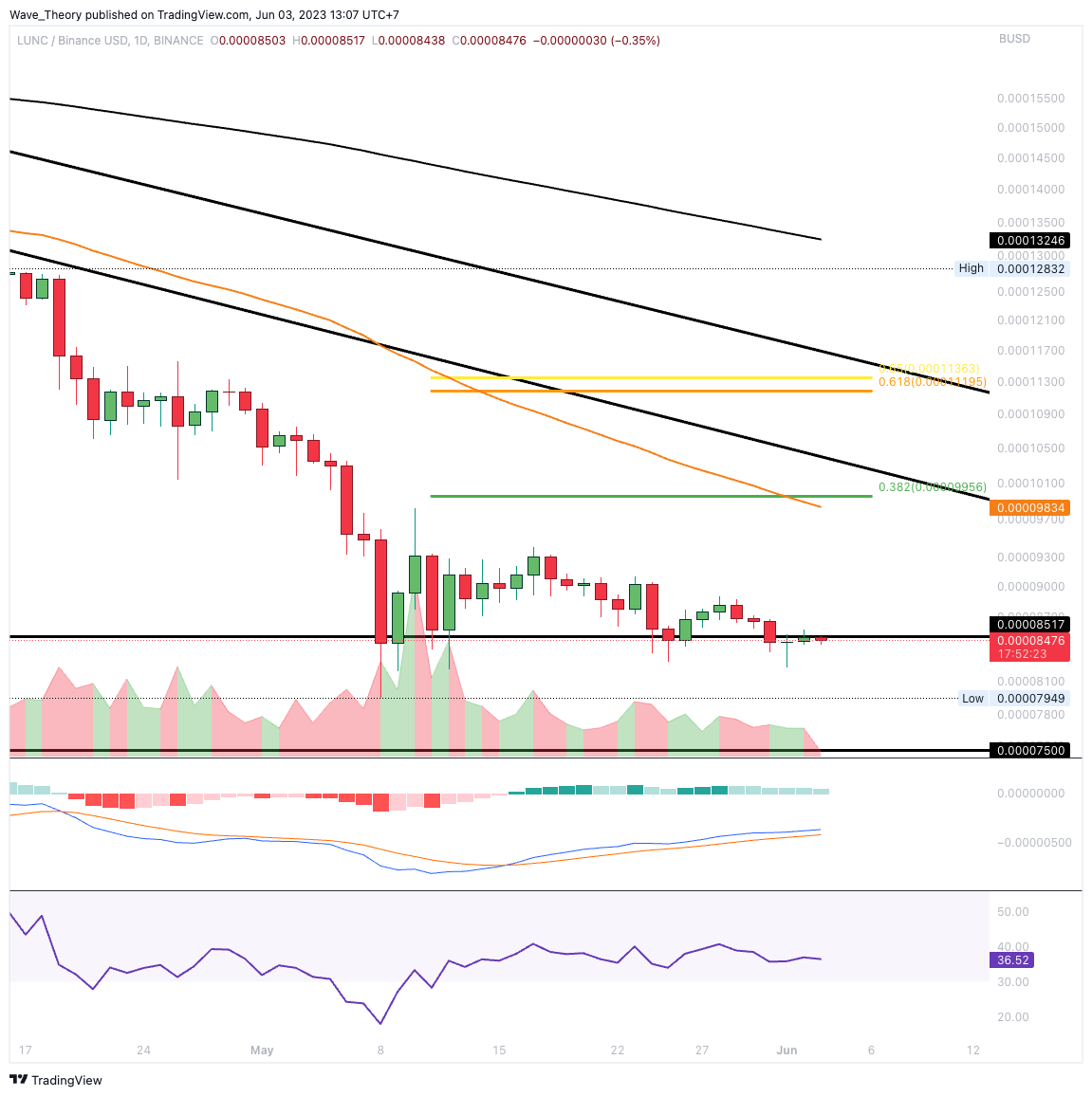 Dies könnte eine Halbierung des Kurses bedeuten. Allerdings scheint LUNC derzeit in der Lage zu sein, an der Unterstützung zwischen etwa 0,000075 USD und 0,0000852 USD abzuprallen.
