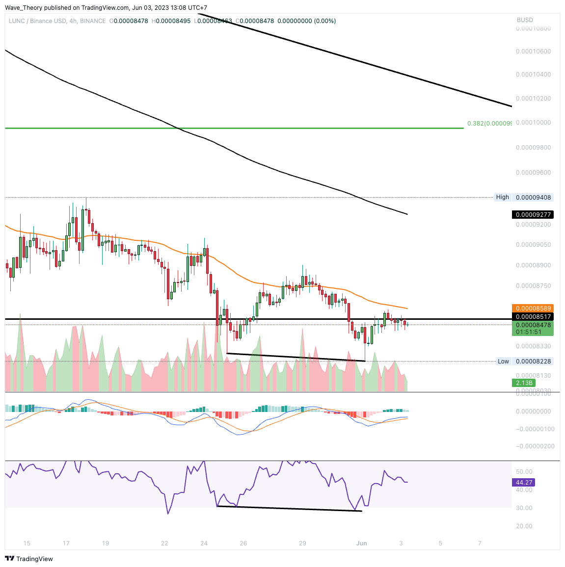 Prallt der LUNC Kurs jetzt ab, warten bereits bei rund 0,0000995 USD und bei rund 0,00012 USD die nächsten signifikanten Fibonacci Widerstände. Knapp darüber liegt zudem ein signifikanter Trendlinienwiderstand, welcher sich fast über den gesamten Bärenmarkt erstreckt.