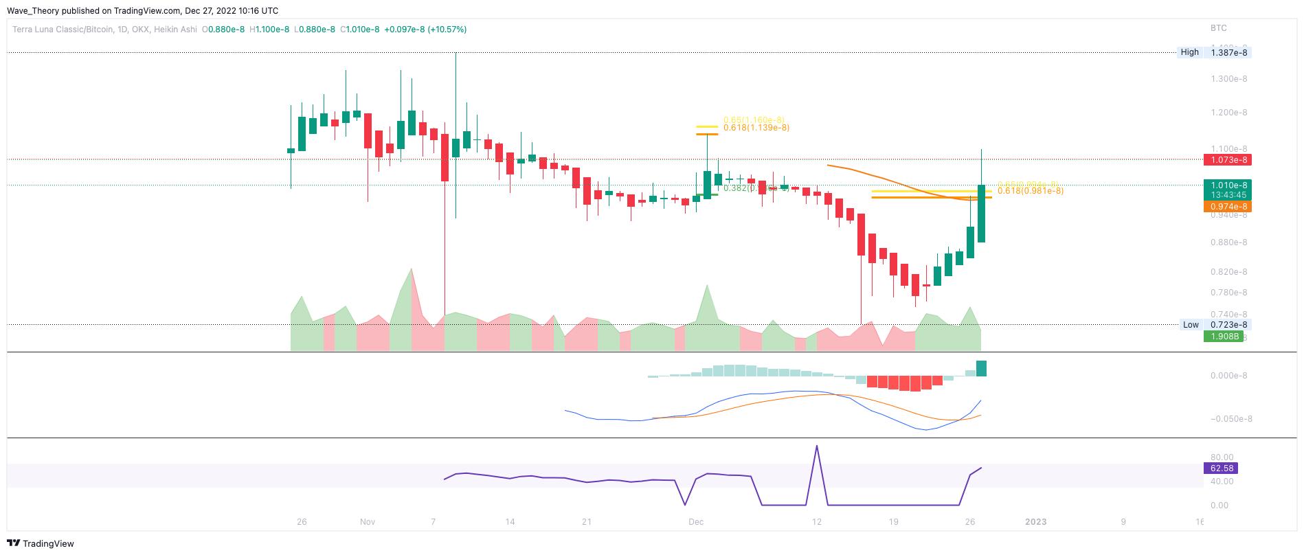 Gegen BTC befindet sich der LUNC Kurs am 50-Tage-EMA Widerstand