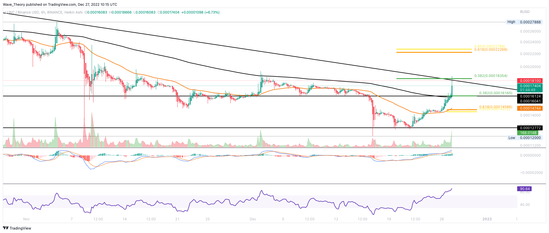 Bricht LUNC das 0,382 Fib Niveau bei rund 0,00018 USD hingegen bullisch, wartet bei rund 0,00022 USD der nächste signifikante Fib Widerstand.