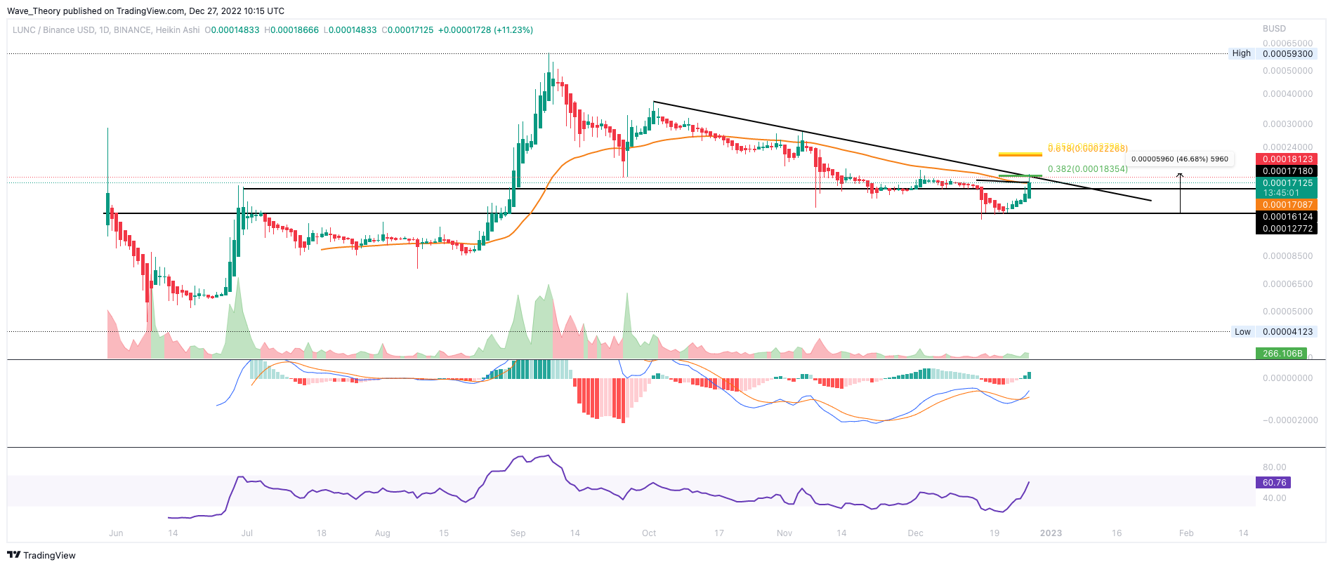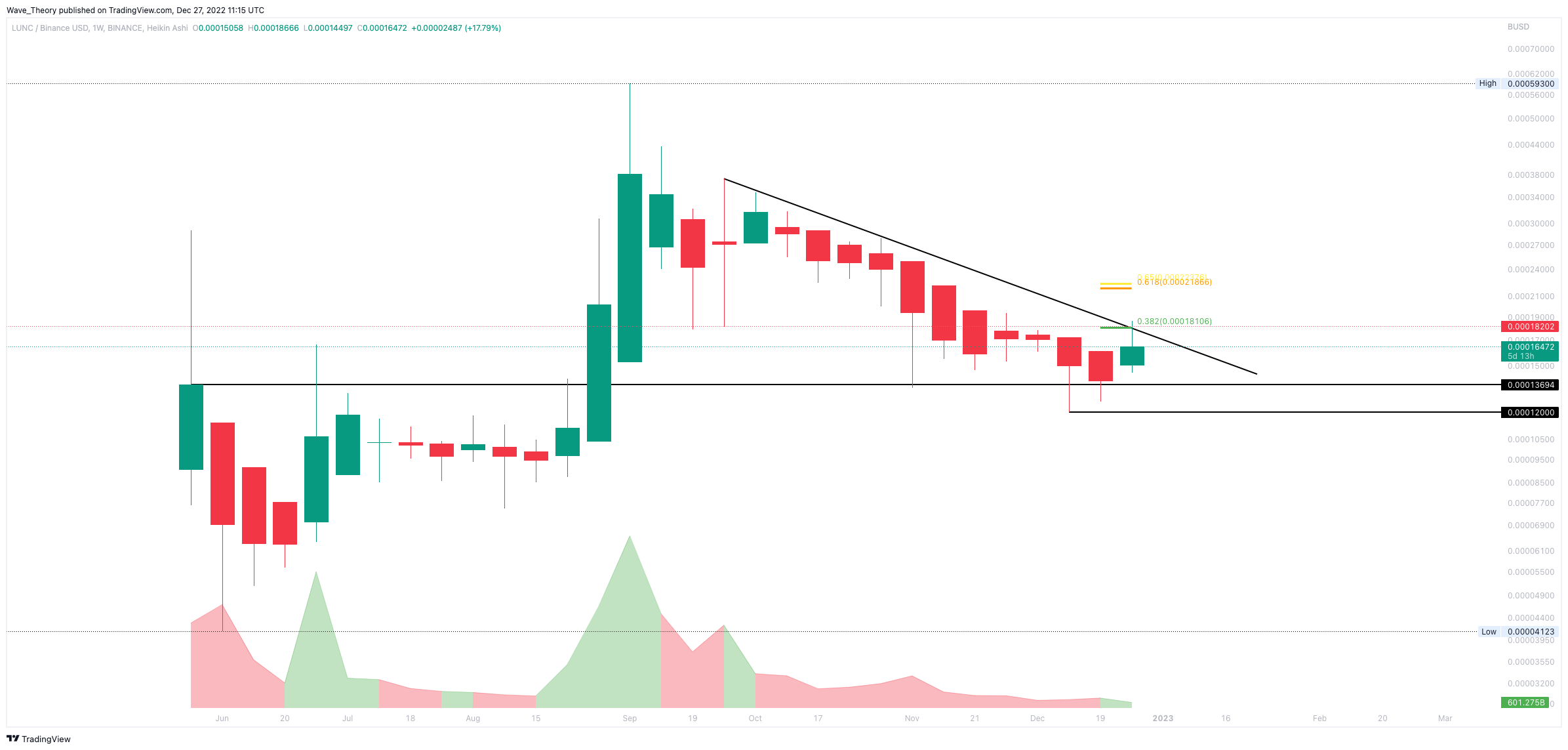 Bricht LUNA Classic diese Widerstände, könnte LUNC den Golden Ratio Widerstand an der bärischen Trendlinie bei rund 0,00023 USD anvisieren. Bei einem Bruch der Trendlinie könnte LUNC bullisch ausbrechen, um die nächsten Fib Widerstände bei rund 0,0003 USD und 0,00042 USD anzuvisieren. Sollte LUNC bärisch abgewiesen werden, wartet nach wie vor zwischen 0,0001277 USD und 0,00016124 USD signifikante Unterstützung auf den LUNC Kurs.”