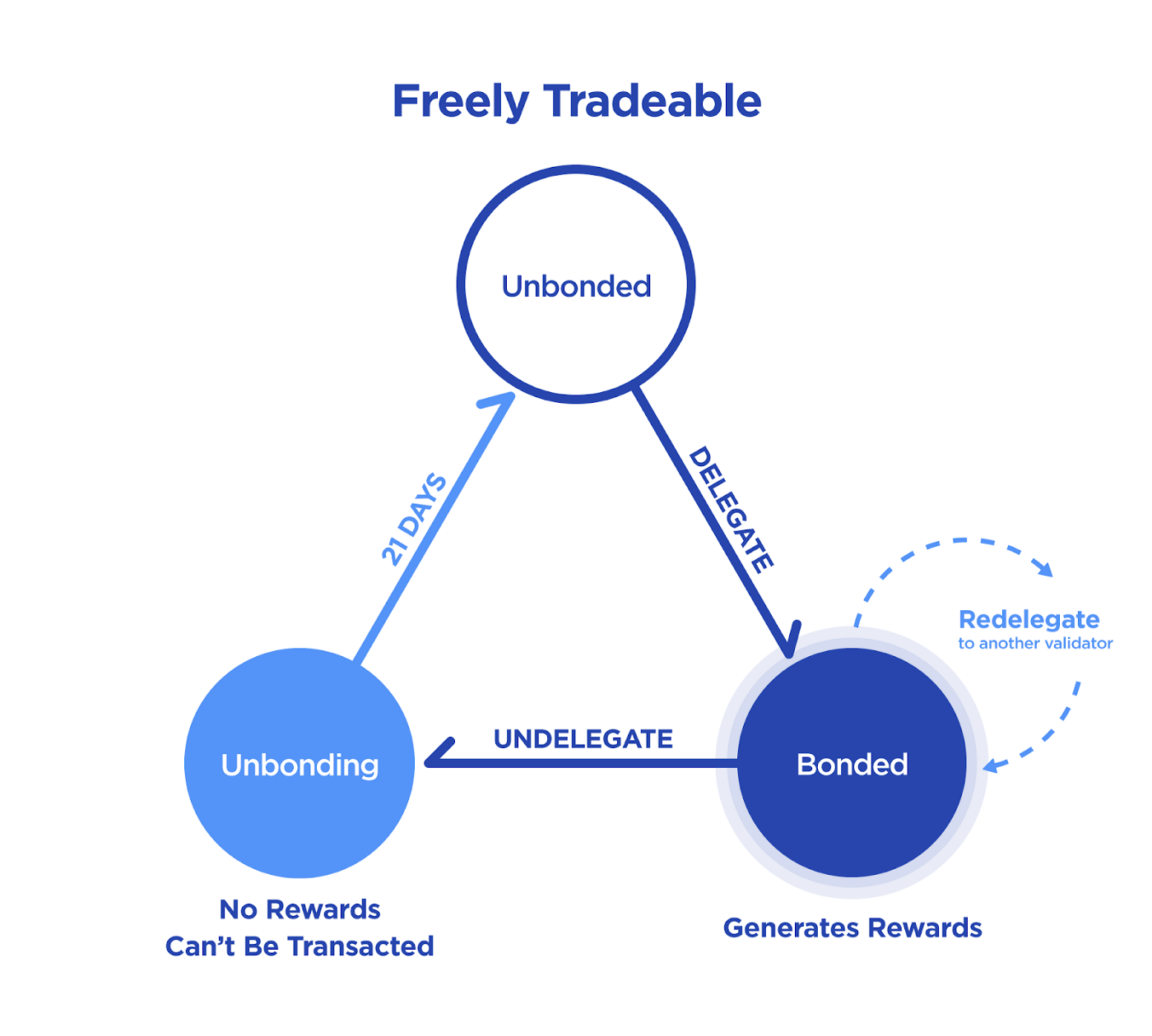 Dem kleinen Bürger wird auch eine Möglichkeit gegeben zu staken. Indem Staker ihre Token auf der TerraStation an Validatoren überlassen. Diese profitieren von einem größeren Anteil am gesamten Kuchen und die Staker bekommen dafür einen Zins. Dieser liegt gerade bei circa 6 Prozent. Die Token sind für mindestens 21 Tage gesperrt. In der untenstehenden Grafik wird dies mit der Bezeichnung “Delegate” beschrieben, in welcher User ihre Token an Validatoren geben. “Bonded” bedeutet einfach, dass User in dieser Zeit an den Validator gebunden sind und Zinsen verdienen.