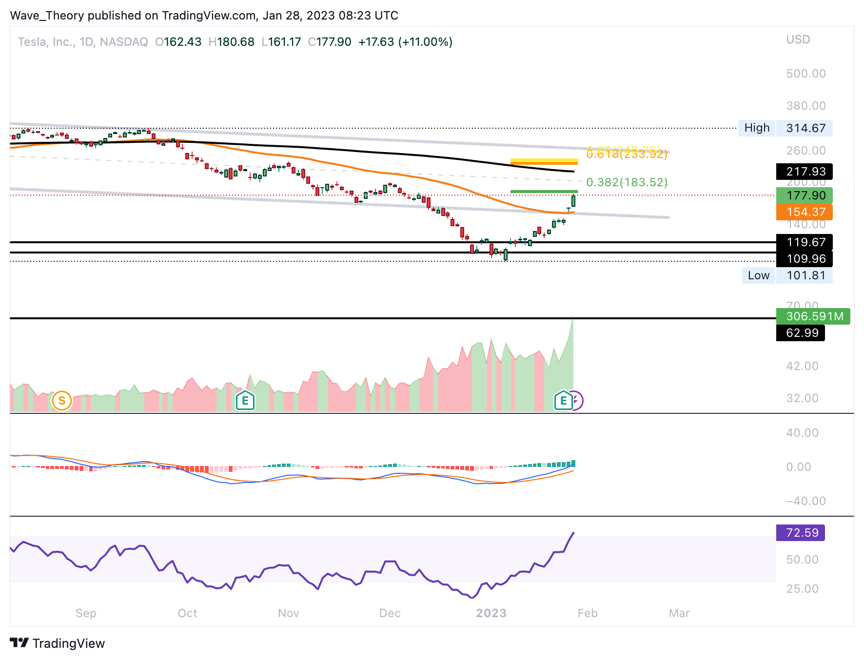 Bereits jetzt am 50-Monate- und 200-Wochen-EMA stößt Tesla auf signifikanten Widerstand. Denn bei rund 183,5 USD liegt zudem das 0,382 Fib Niveau. Bricht Tesla diesen Widerstand, wartet zwischen rund 223 USD und rund 235 USD der nächste signifikante Widerstand.