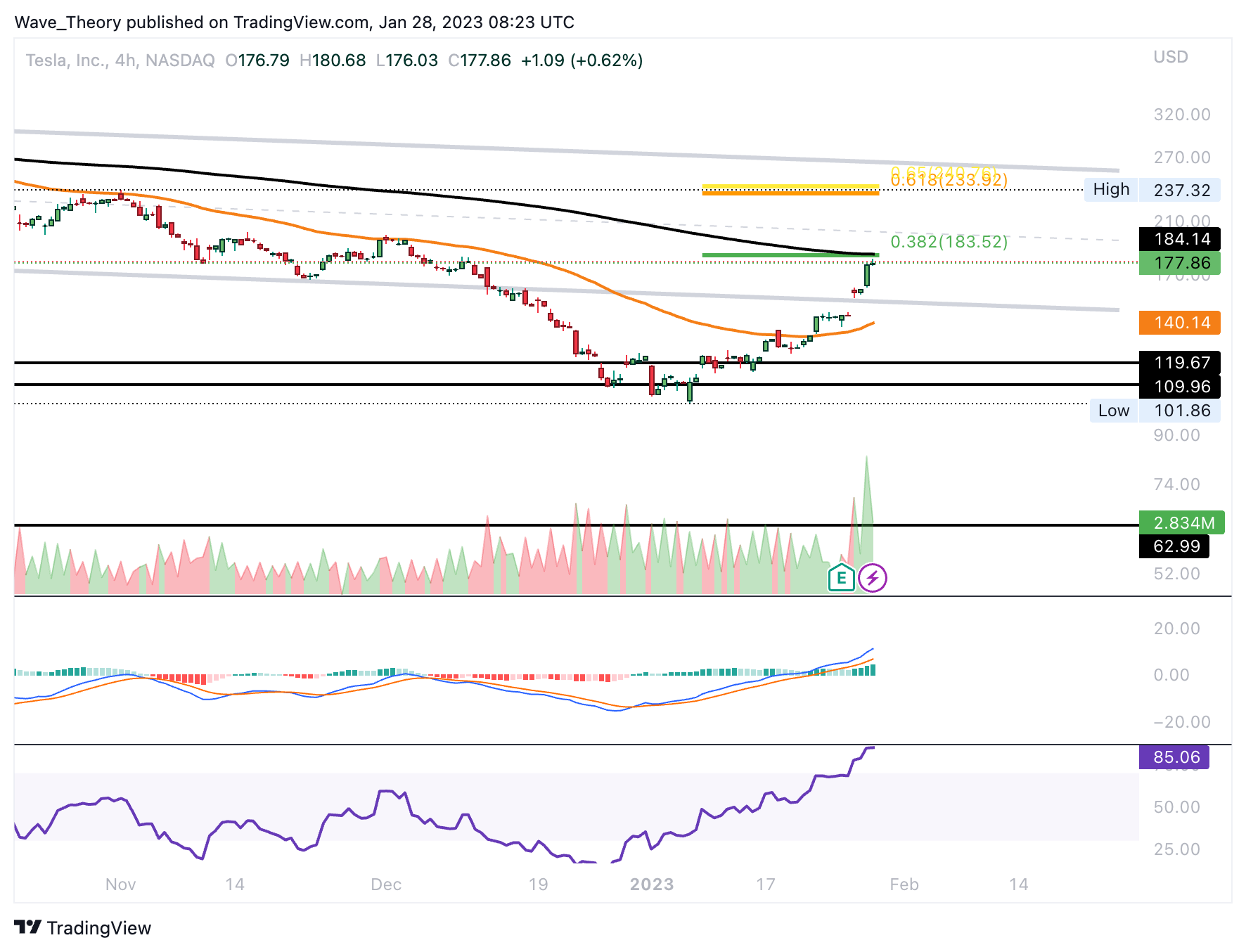 Bärisch ist hingegen, dass sich die EMAs im Tageschart noch immer in einem Death Cross befinden, womit der Trend kurz- bis mittelfristig bärisch bestätigt bleibt. Dennoch ist der starke Anstieg des Handelsvolumens ein sehr bullisches Zeichen für den Tesla Kurs.