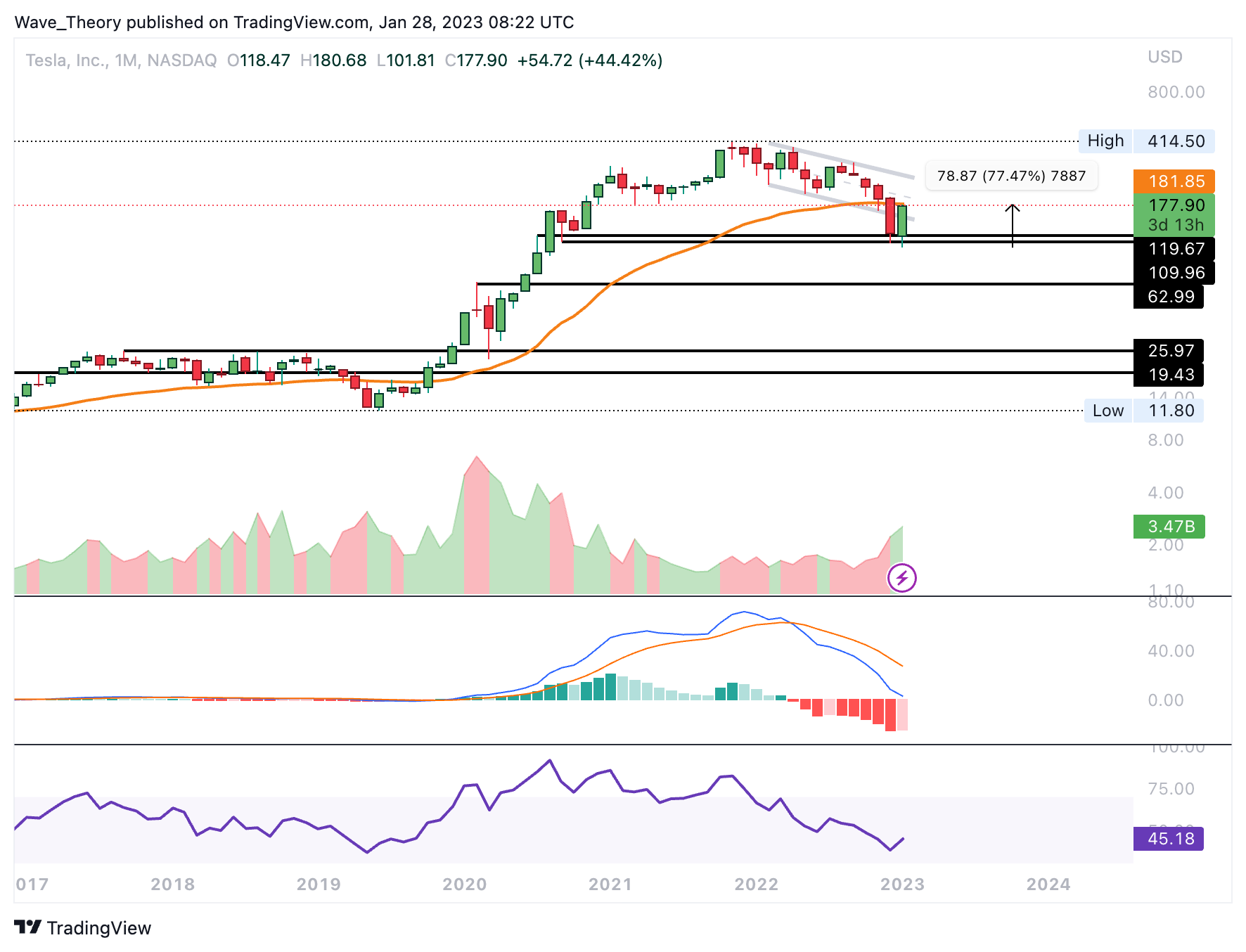 Die Tesla Aktie konnte an der Unterstützung zwischen rund 110 USD und 120 USD derart heftig abprallen, dass ein Kurssturz zur nächsten Unterstützung bei rund 63 USD ausblieb. Stattdessen konnte der Kurs knapp 77,5 % steigen, womit sich Tesla jetzt am 50-Monate-EMA bei rund 182 USD befindet.