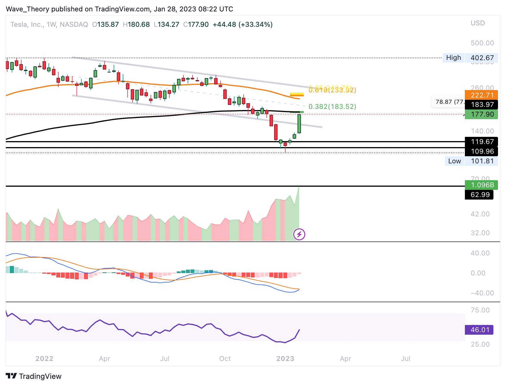 An diesem Widerstand könnte Tesla jetzt bärisch abgewiesen werden, um die Abwärtsbewegung fortzusetzen. Andererseits hat Tesla die Chance auf eine “Bullish-Engulfing-Candle” im Monatschart, sofern der Monatsschlusskurs über 197 USD steht. Dann könnte die Tesla Aktie die nächsten signifikanten Fib Widerstände anvisieren.