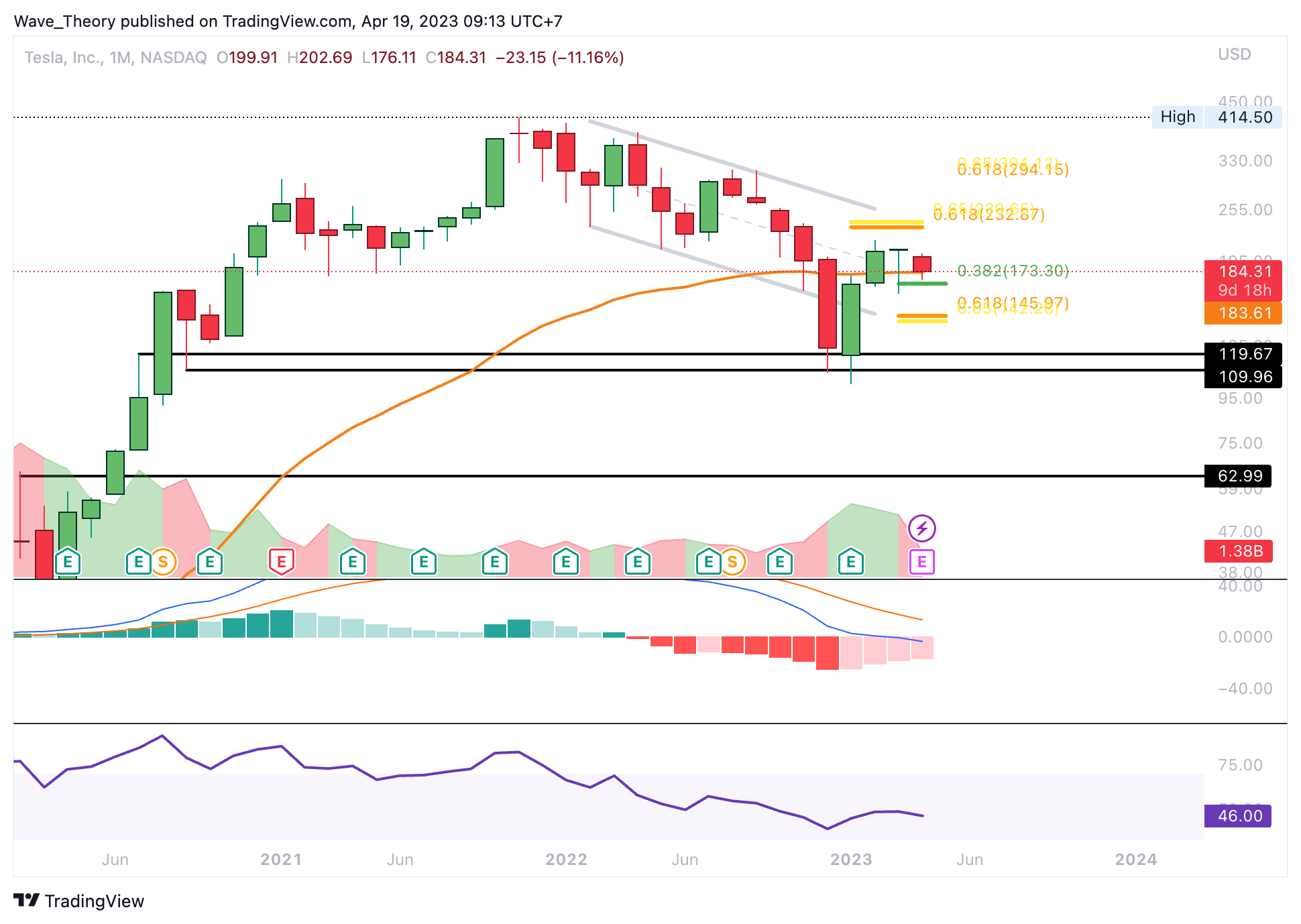 Dabei hat das Jahr so bullisch für den Tesla Kurs begonnen, als Tesla an der 100 US-Dollar Marke abprallen und dabei sogar den 50-Monate-EMA Widerstand bei rund 184 USD brechen konnte. Darüber hinaus tickt das Histogramm des MACDs den vierten Monat in Folge bullisch höher.