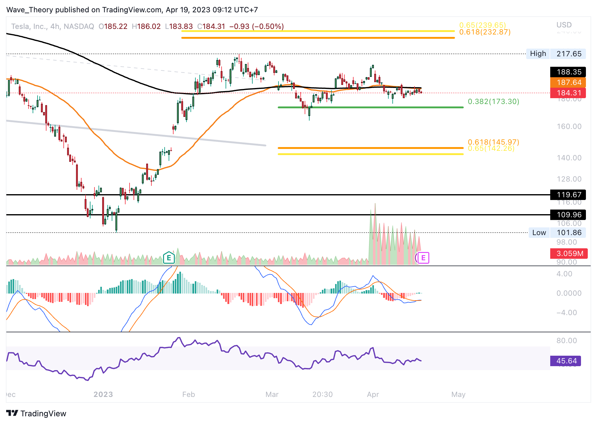 Doch aktuell scheint Tesla bereits an dem Widerstand der EMAs bei rund 188 USD bärisch abgewiesen zu werden. Wenn Tesla die 0,382 Fib Unterstützung bei rund 173,3 USD bricht, könnte Tesla zur Golden Ratio bei rund 145 USD korrigieren. Wenn Tesla diese Unterstützung ebenfalls bricht, könnte Tesla den Abwärtstrend fortsetzen und womöglich auf einen neuen Tiefpunkt fallen.