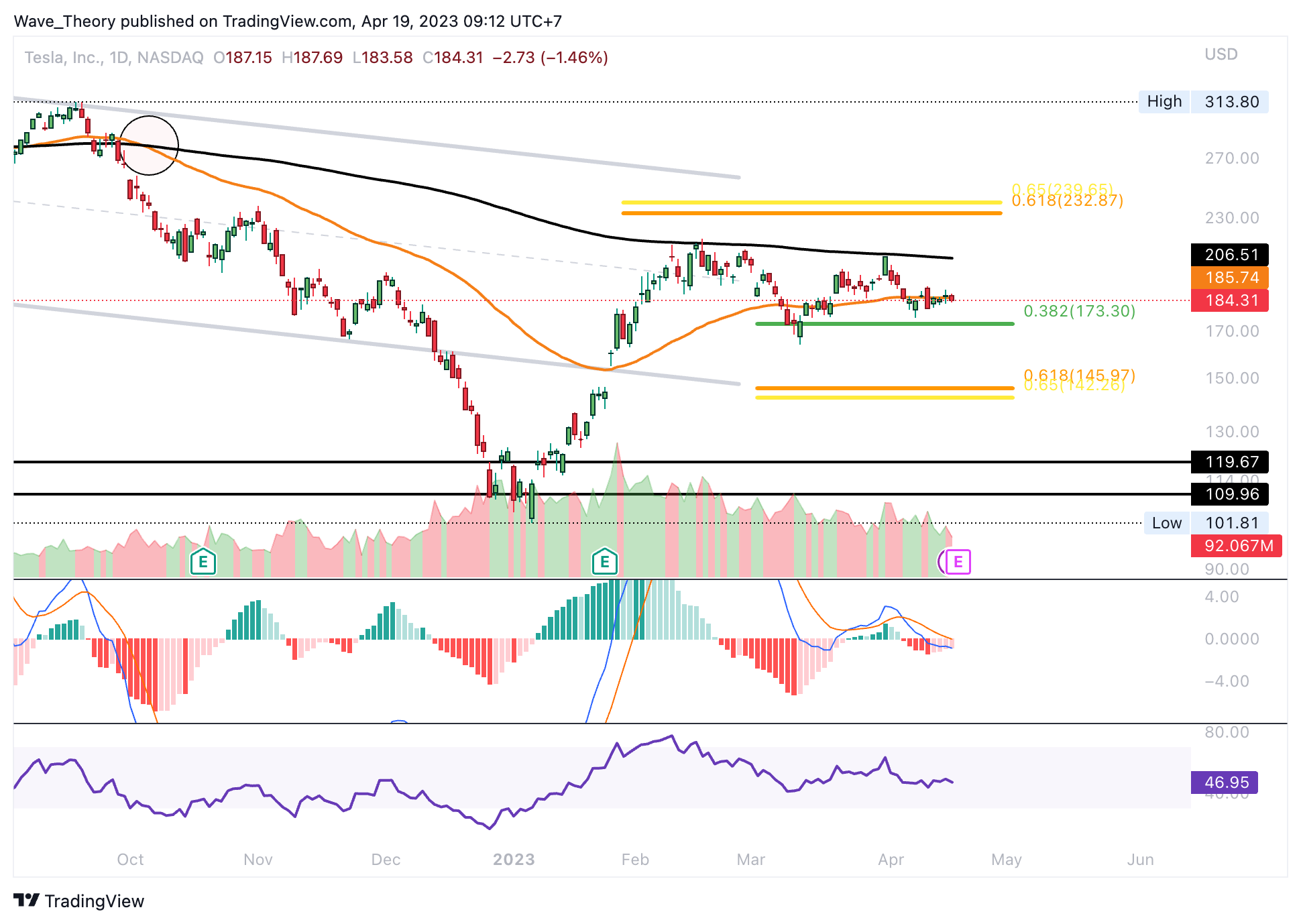 Seit Monaten bewegt sich der Tesla Kurs jetzt schon zwischen der 0,382 Fib Unterstützung bei rund 173,3 USD und dem 200-Tage-EMA Widerstand bei rund 206,5 USD. Zwar hat Tesla immer noch Chancen auf eine Fortsetzung der Aufwärtsbewegung, sofern sich der Kurs über der Golden Ratio bei rund 145 USD hält.