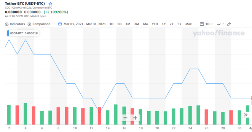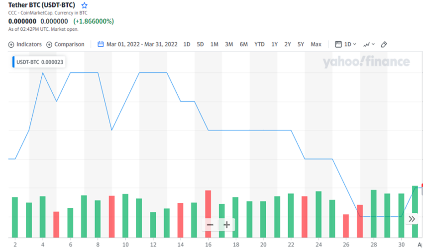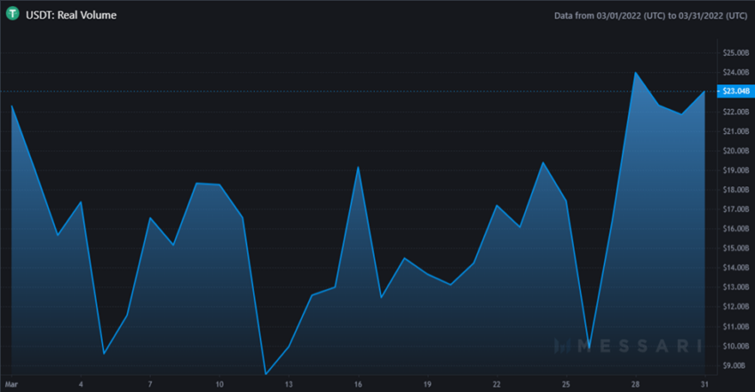 Im vergangenen Monat spiegelte sich der reale jährliche Volumenrückgang im USDT/BTC-Handelsvolumen wider. Dieses lag bei im März 2022 rund 45 Millionen US-Dollar, während es im März 2021 noch bei 50 Millionen US-Dollar lag.