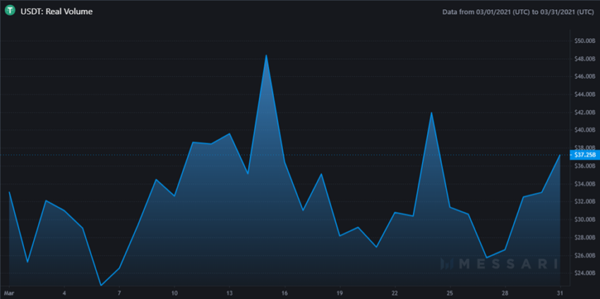 Das reale Tether-Handelsvolumen ist im Monat März etwas gestiegen, aber seit 2021 um mehr als 500 Milliarden US-Dollar gefallen.