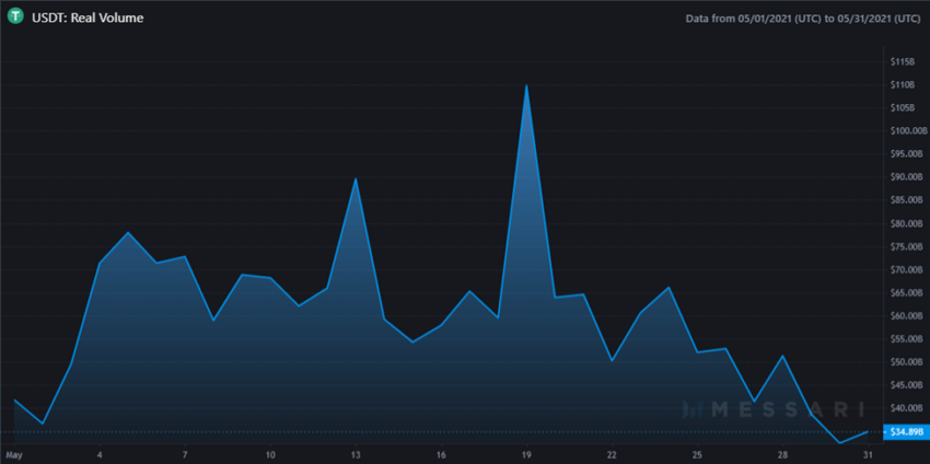 In den ersten beiden Wochen vom Mai 2021 ist die Nachfrage von Investoren nach digitalen Assets stark angestiegen. Zu dieser Zeit erreichten die Kurse vieler Coins neue Rekordwerte. In den letzten zwei Wochen des Monats kam es jedoch zu einer starken Korrekturphase, bei denen die Preise dieser Coins unter dem Eröffnungskurs vom Mai lag. Ende des Monats lag das echte Handelsvolumen von Tether-Token dann bei 1,84 Billionen US-Dollar. Am Ende des letzten Monats verzeichnete das Tether-Handelsvolumen einen Rückgang des realen Volumens um 72 % im Vergleich zum Mai des letzten Jahres.
