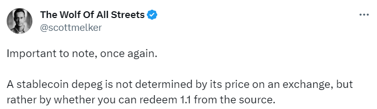 “Ein Stablecoin-Depeg wird nicht durch seinen Preis an einer Börse bestimmt, sondern vielmehr dadurch, ob man 1,1 von der Quelle einlösen kann.”