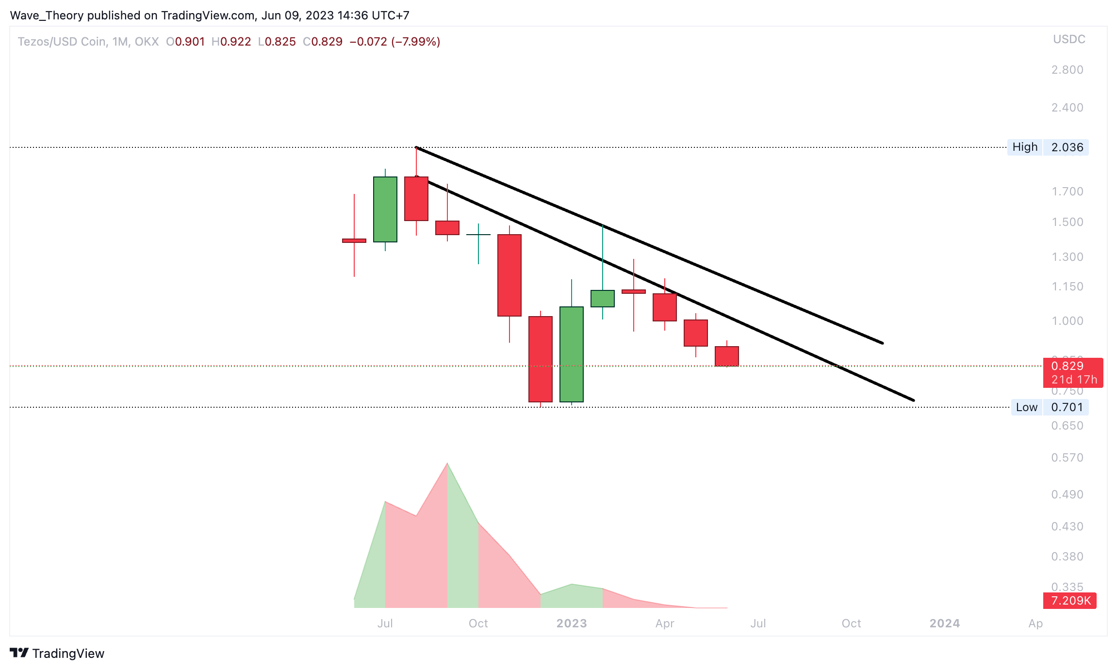 Über den Januar und Februar dieses Jahres hinweg konnte der Tezos Kurs über 112 % steigen. Anschließend folgten jedoch drei bärische Monate am Stück und auch in diesem Monat scheint Tezos den Abwärtstrend fortzusetzen.