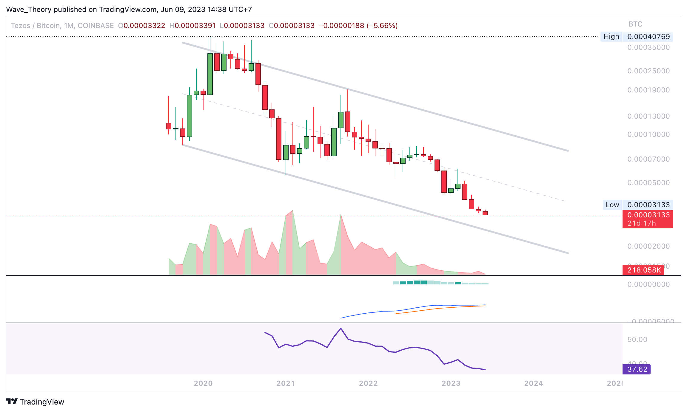 Auch gegen BTC liegt ein starker Abwärtstrend vor. Nach unten hin warten keine weiteren Unterstützungen mehr, weshalb das Abwärtspotenzial nahe 0 unbegrenzt ist. Des Weiteren tickt das Histogramm des MACDs seit einigen Wochen bärisch tiefer und auch die MACD Linien könnten sich bald bärisch überkreuzen. Der RSI erreicht dabei allmählich überverkaufte Regionen.