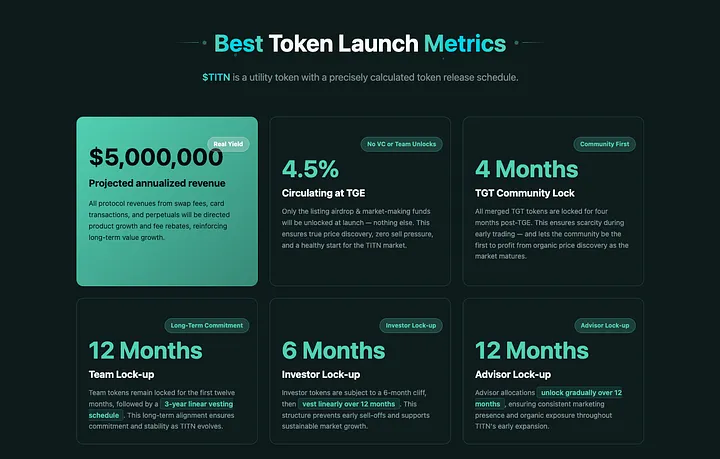 TITNs Launch-Struktur priorisiert Marktstabilität und Community-Ausrichtung. Beim Listing sind nur Token im Umlauf, die Liquiditätspools und Binance Wallet Airdrops zugeteilt wurden – ohne Team- oder Investor-Unlocks beim TGE.