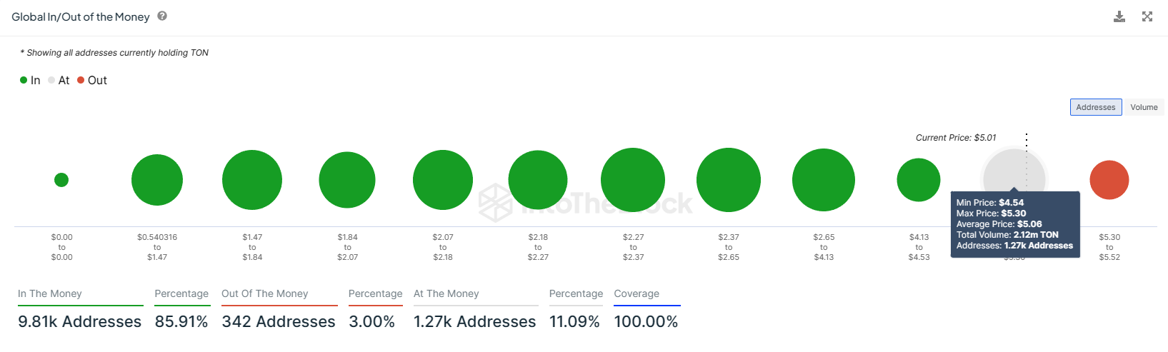 Besonders da der Kurs über der 5,00 USD-Marke liegt, stehen Toncoin-Investoren an einem entscheidenden Punkt. Viele betrachten dies als ein positives Zeichen, hauptsächlich wegen der Global In/Out of the Money (GIOM)-Analyse.