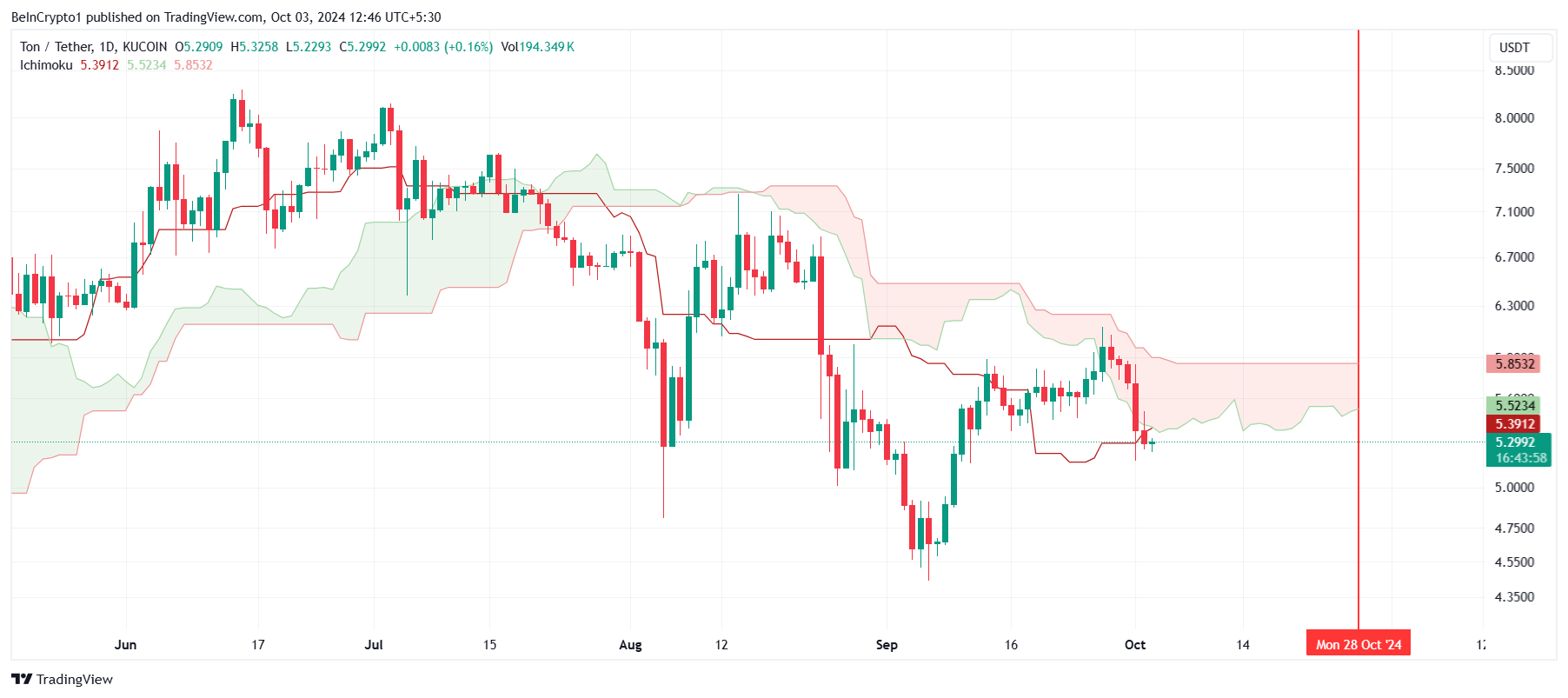 Der Ichimoku-Cloud-Indikator signalisiert erhebliche Bärenstimmung für Toncoin. Die Wolke befindet sich über den Kerzen, was allgemein als negatives Zeichen für den Kursverlauf angesehen wird.