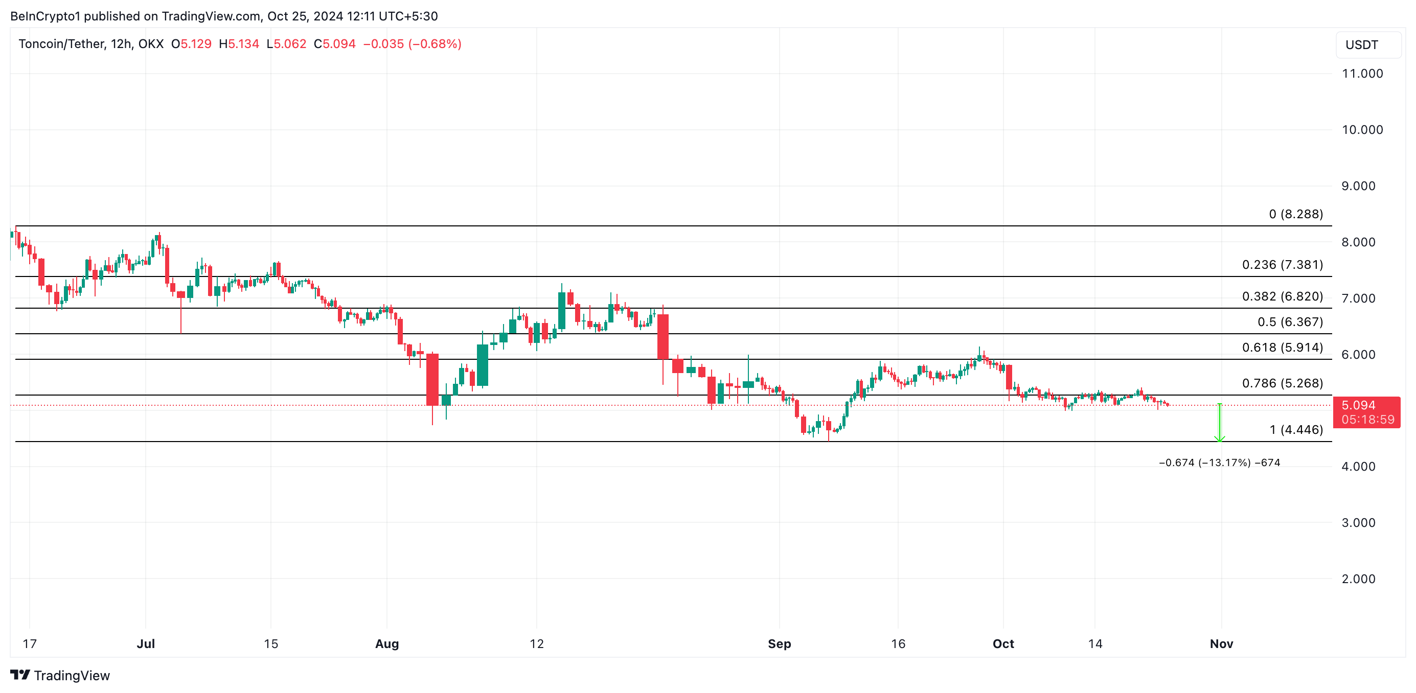 Zum Zeitpunkt des Schreibens wird Toncoin zu 5,09 USD gehandelt. Bei nachlassendem Kaufdruck könnte die Altcoin auf ihr Tief vom 6. September von 4,46 USD fallen, was einen potenziellen Rückgang von 13 Prozent vom aktuellen Kurs bedeutet.