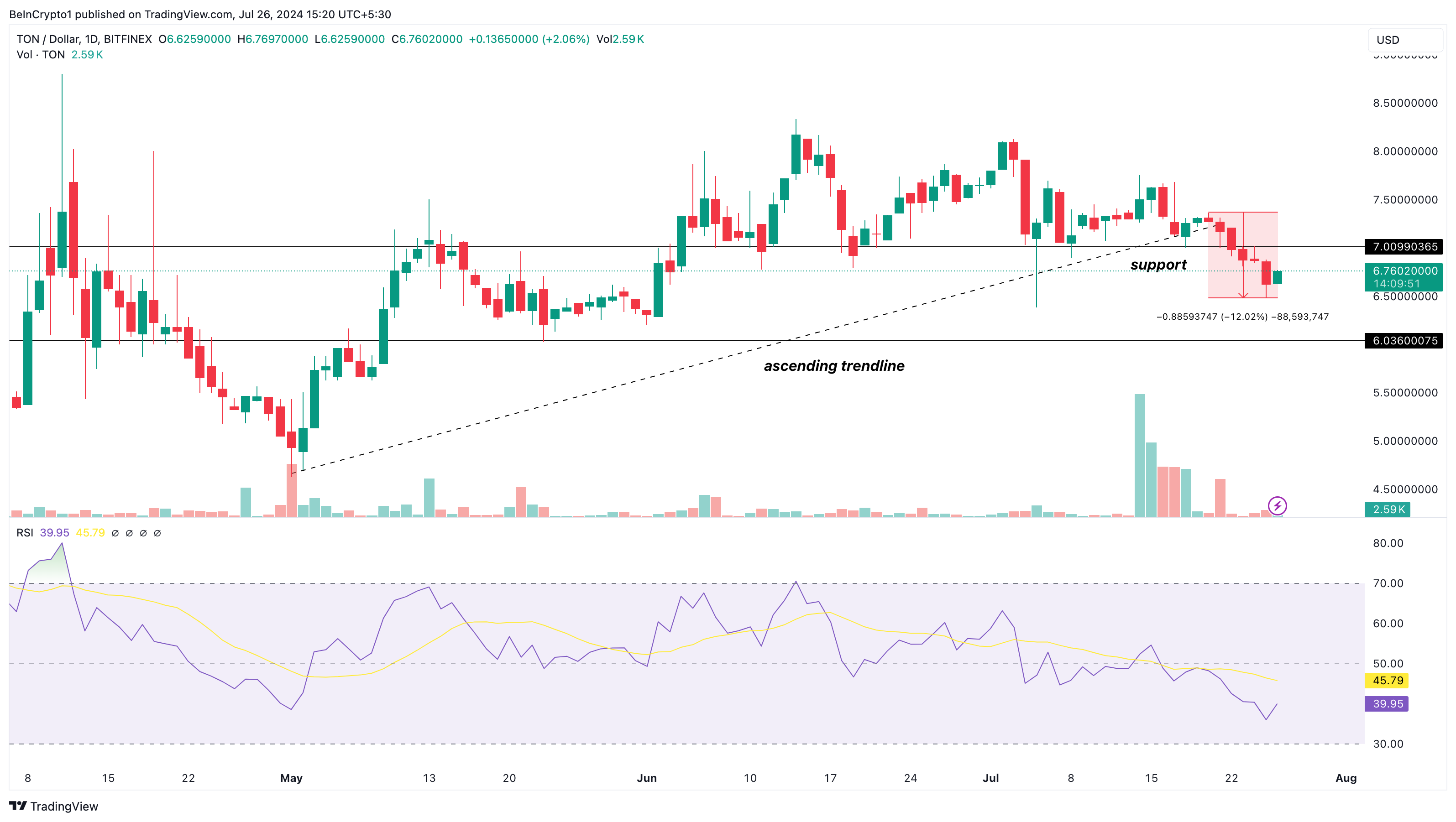 Zwischen Mai und dem 21. Juli bildete TON eine aufsteigende Trendlinie, die sicherstellte, dass der Kurs nicht unter 6,03 USD fiel. Doch aktuelle Daten zeigen, dass der Kurs unter die Trendlinie und die Unterstützung bei 7,00 USD gefallen ist.