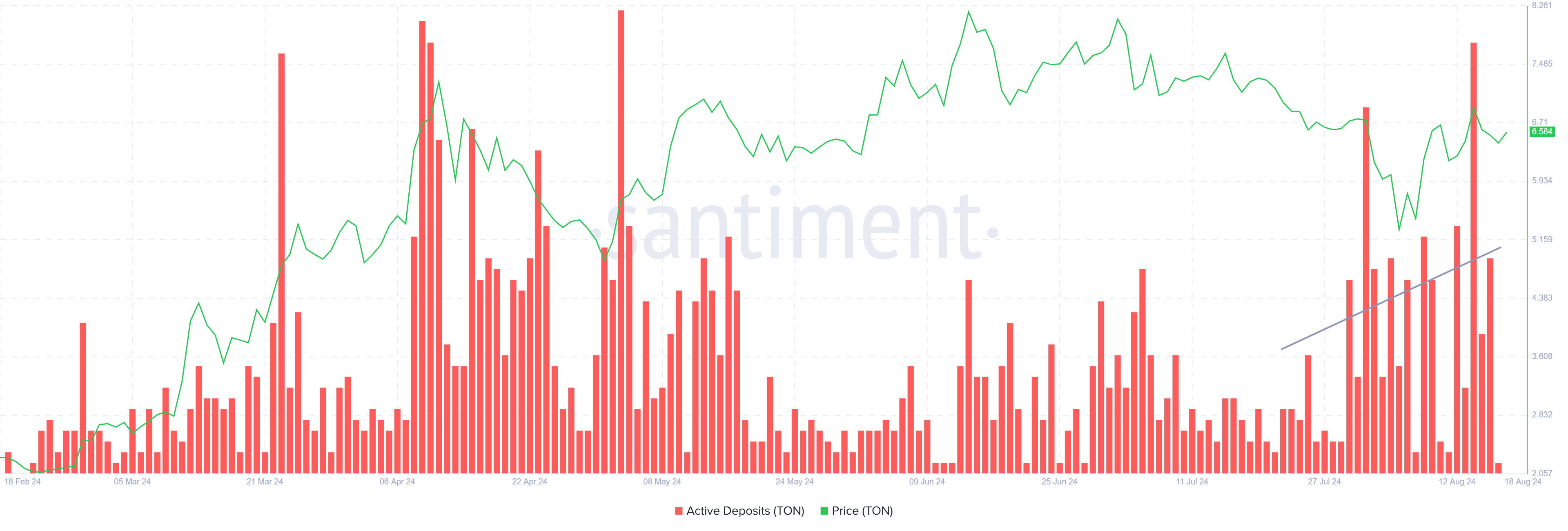 Gleichzeitig deutet der Anstieg der aktiven Einzahlungen darauf hin, dass TON-Investoren sich möglicherweise auf einen Verkauf vorbereiten. Die zunehmenden Spitzen in diesem Indikator signalisieren eine höhere Bewegung von Vermögenswerten aus den Wallets der Investoren zu den Börsen, was typischerweise ein Zeichen für potenziellen Verkaufsdruck ist.