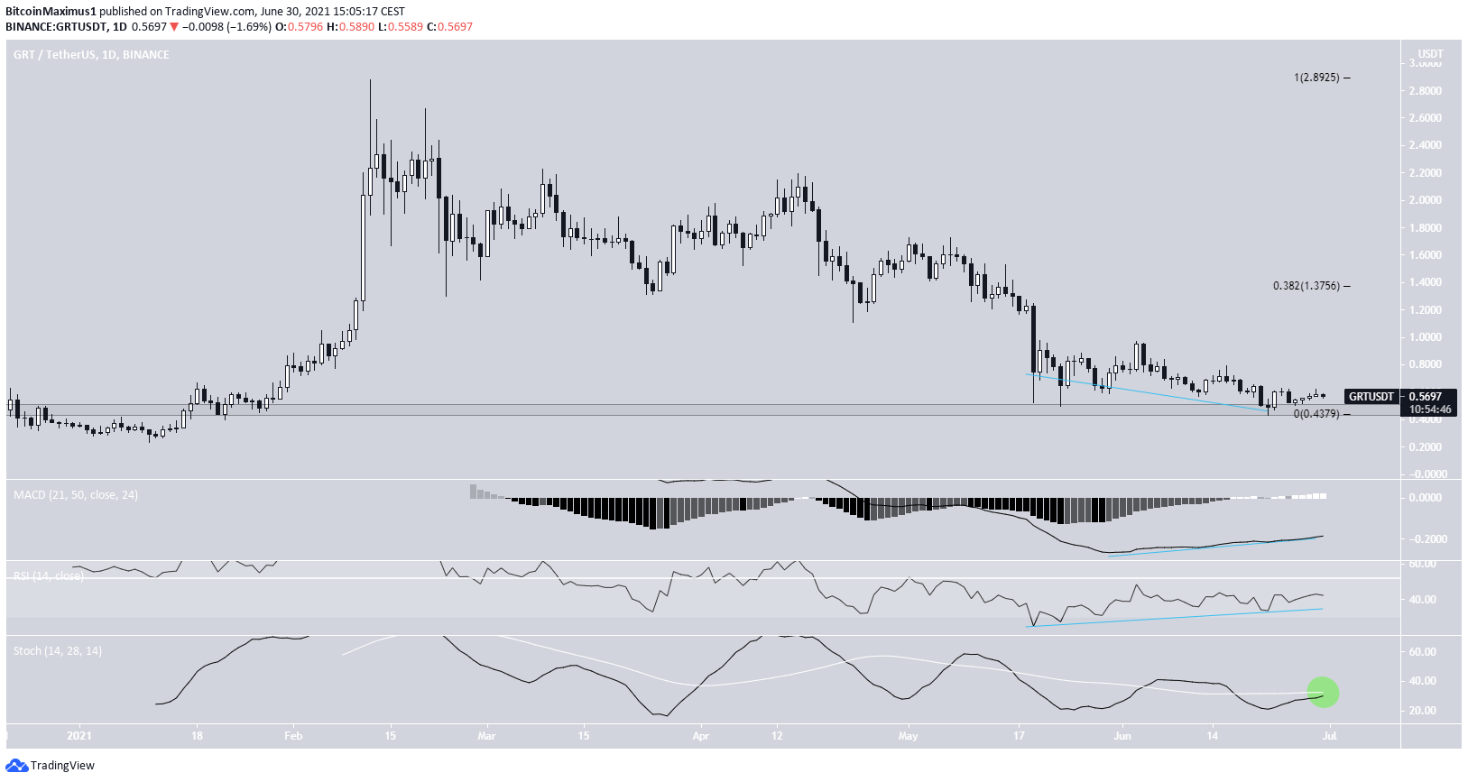Sponsored SponsoredDer GRT Preis ist, seitdem er am 12. Februar 2021 das letzte Allzeithoch erreicht hat, gefallen. Der GRT Preis erreichte am 22. Juni 2021 den letzten Tiefpunkt bei 0.428 USD. Danach validierte der GRT Kurs validierte den Bereich bei 0.47 USD als Support. Außerdem gibt es sowohl auf dem RSI als auch auf dem MACD eine nennenswerte bullische Divergenz zu sehen. Deshalb ist es durchaus wahrscheinlich, dass der GRT Kurs von dem Support-Level abprallen wird. Sollte sich die Aufwärtsbewegung fortsetzen, dann wird er bei 1.37 USD auf Widerstand stoßen.