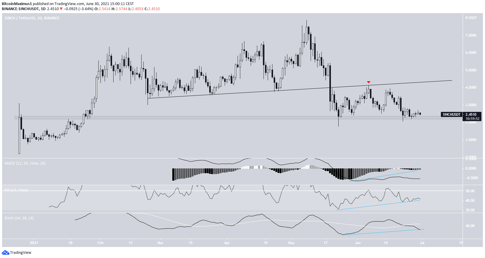 Der 1INCH Kurs ist am 23. Mai 2021 von dem Support-Bereich bei 2.25 USD abgeprallt, allerdings ist der 1INCH Preis danach wieder auf diesen gefallen. Es könnte sein, dass wir bald ein Double-Bottom-Pattern auf dem Chart sehen werden. Zudem gibt es eine starke bullische Divergenz auf dem RSI, auf dem MACD und auf dem Stochastic Oscillator zu sehen. Auch wenn wir deshalb bald eine neue Aufwärtsbewegung sehen könnten, so können wir erst wieder davon ausgehen, dass der Trend bullisch ist, wenn der 1INCH Preis die unten gezeigte Linie erneut als Support validiert.