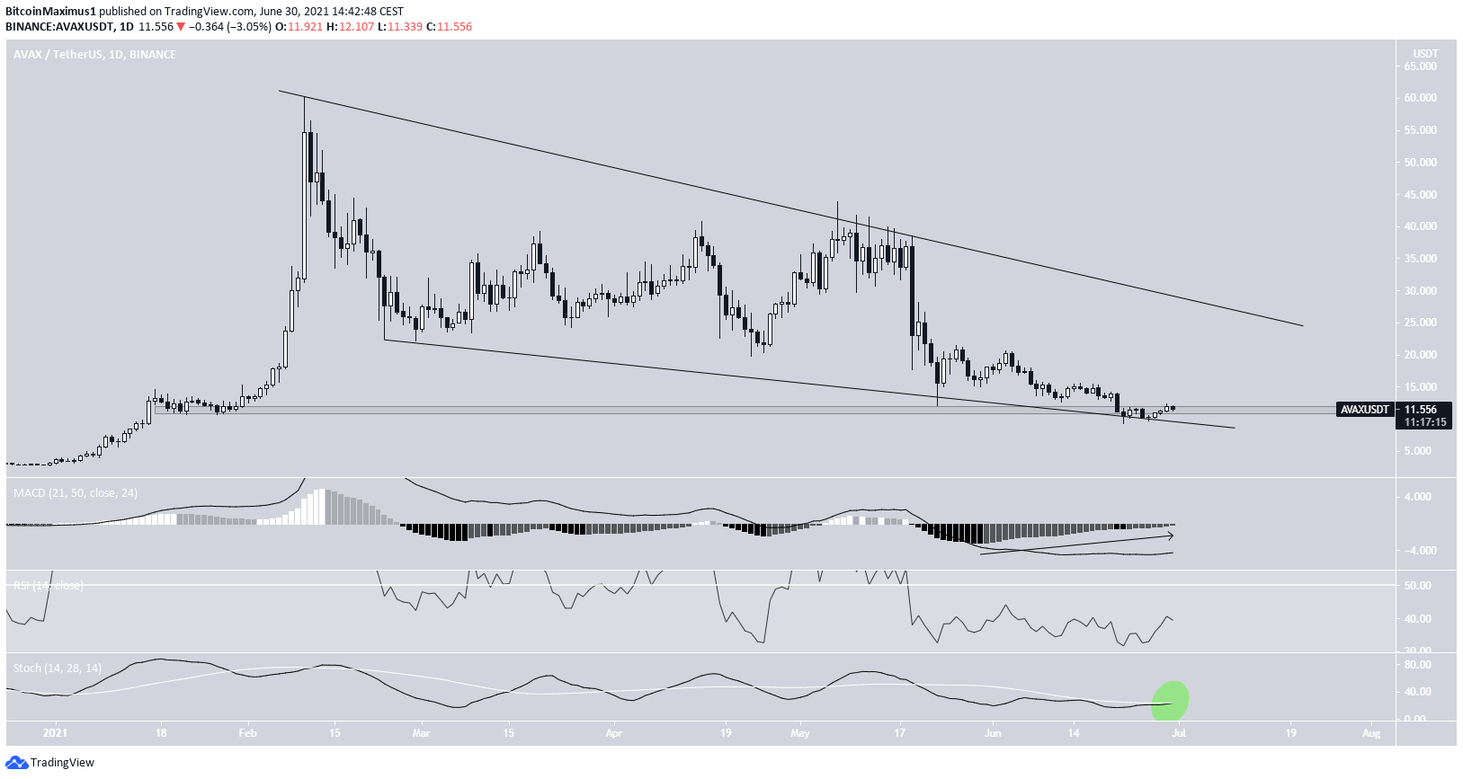 Der AVAX Preis ist, seitdem er am 10. Februar 2021 das letzte Allzeithoch erreicht hat, gefallen. Der AVAX Preis folgte einer absteigenden Widerstandslinie und wird zudem möglicherweise innerhalb eines absteigenden Keilmusters gehandelt. Am 22. Juni 2021 erreicht der AVAX Kurs die absteigende Unterstützungslinie, die sich mit dem Supportbereich bei 11.30 USD überschneidet. Sollte der AVAX Kurs nicht von dem Level abprallen, dann, könnte es eine starke Abwärtsbewegung geben, da es unter diesem Preis nur wenig Support gibt. Die technischen Indikatoren geben uns einige bullische Signale. Es gibt eine bullische Divergenz auf dem MACD-Histogramm zu sehen. Außerdem könnte es bald eine bullische Überkreuzung der Signallinien des Stochastic Oscillators geben.