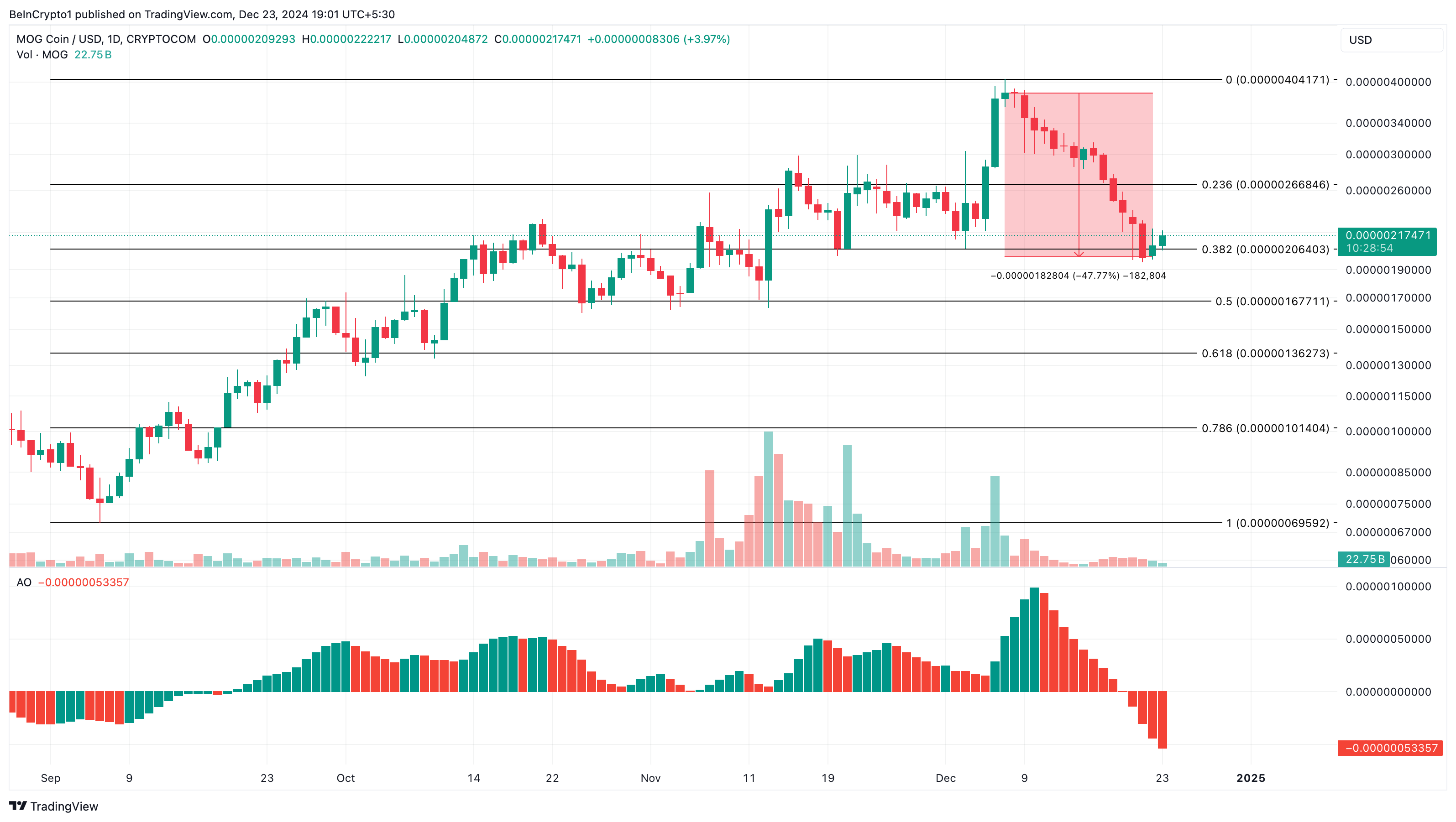 Aber für MOG stach es heraus und erreichte ein Allzeithoch von 0,0000040 USD am 6. Dezember. Zum Zeitpunkt der Veröffentlichung wird der Token bei 0,0000022 USD gehandelt und fiel kürzlich um 47,70 Prozent von diesem Höchststand.